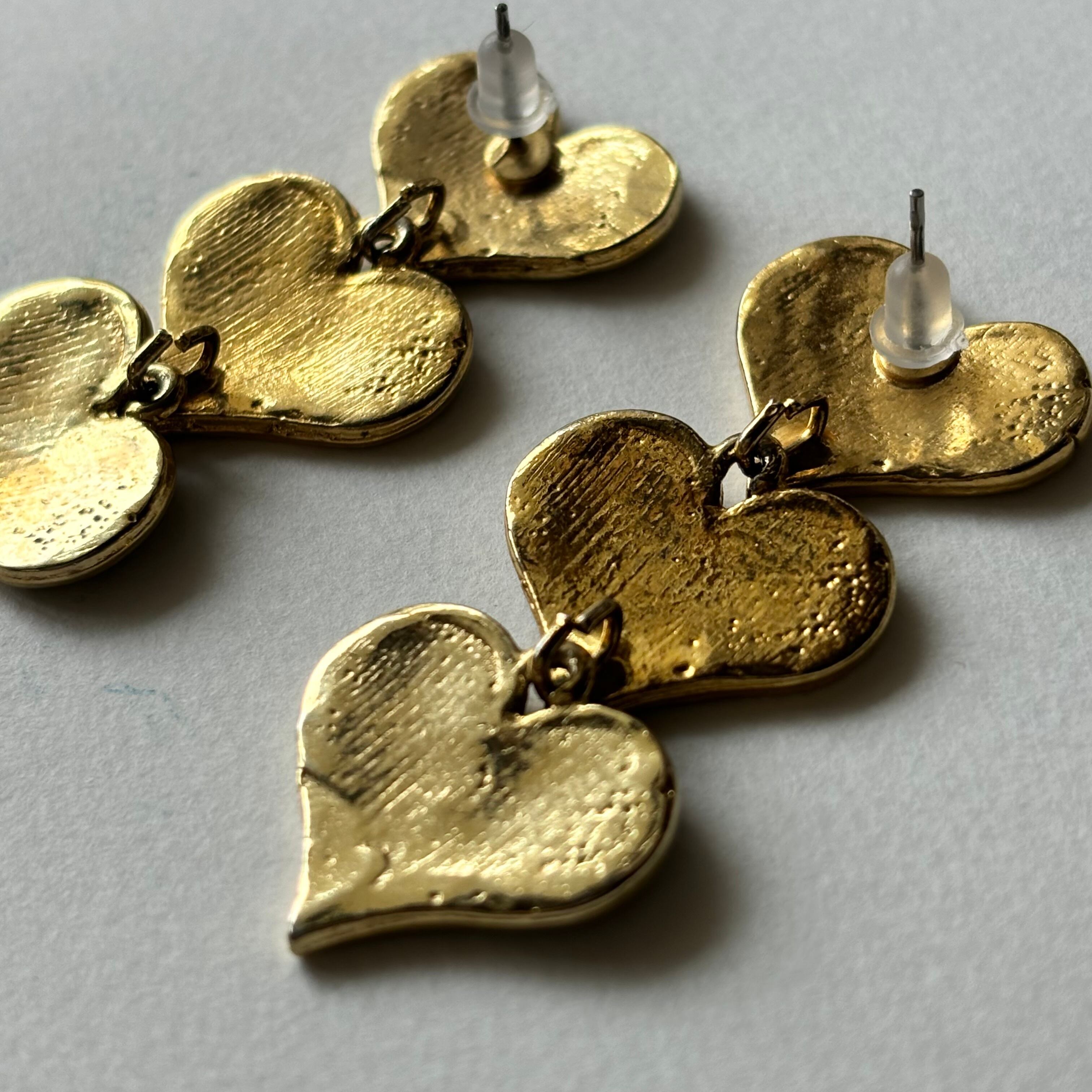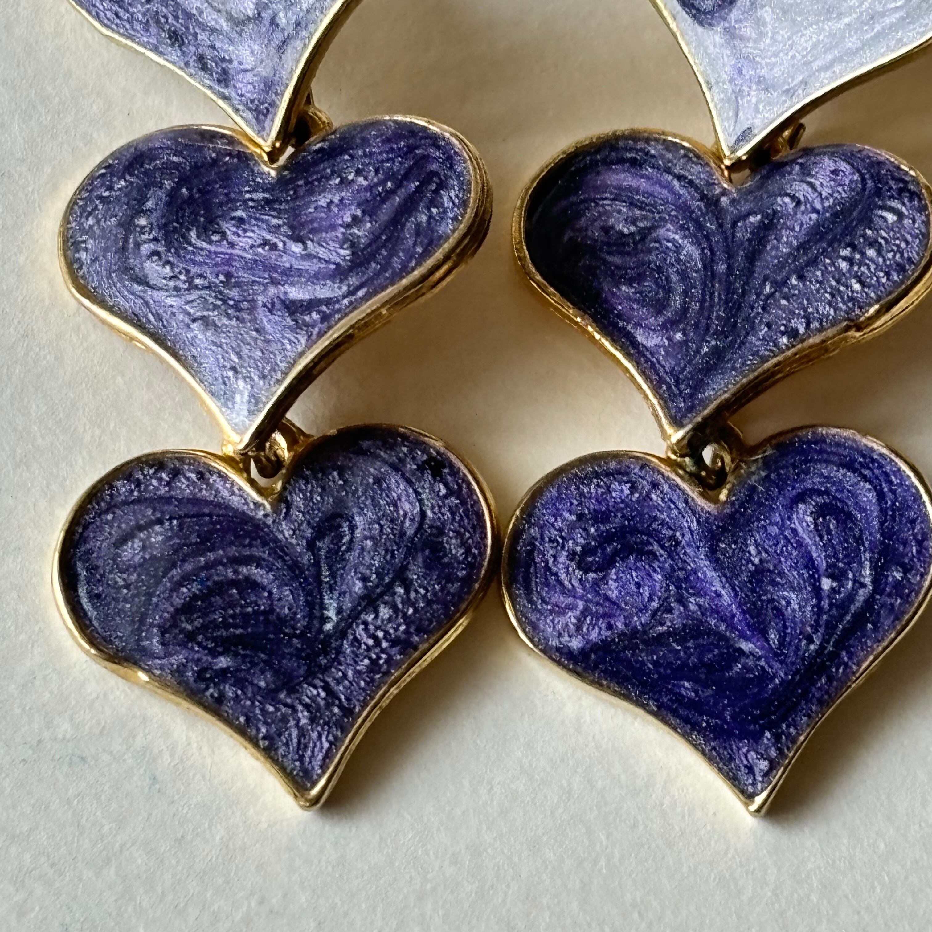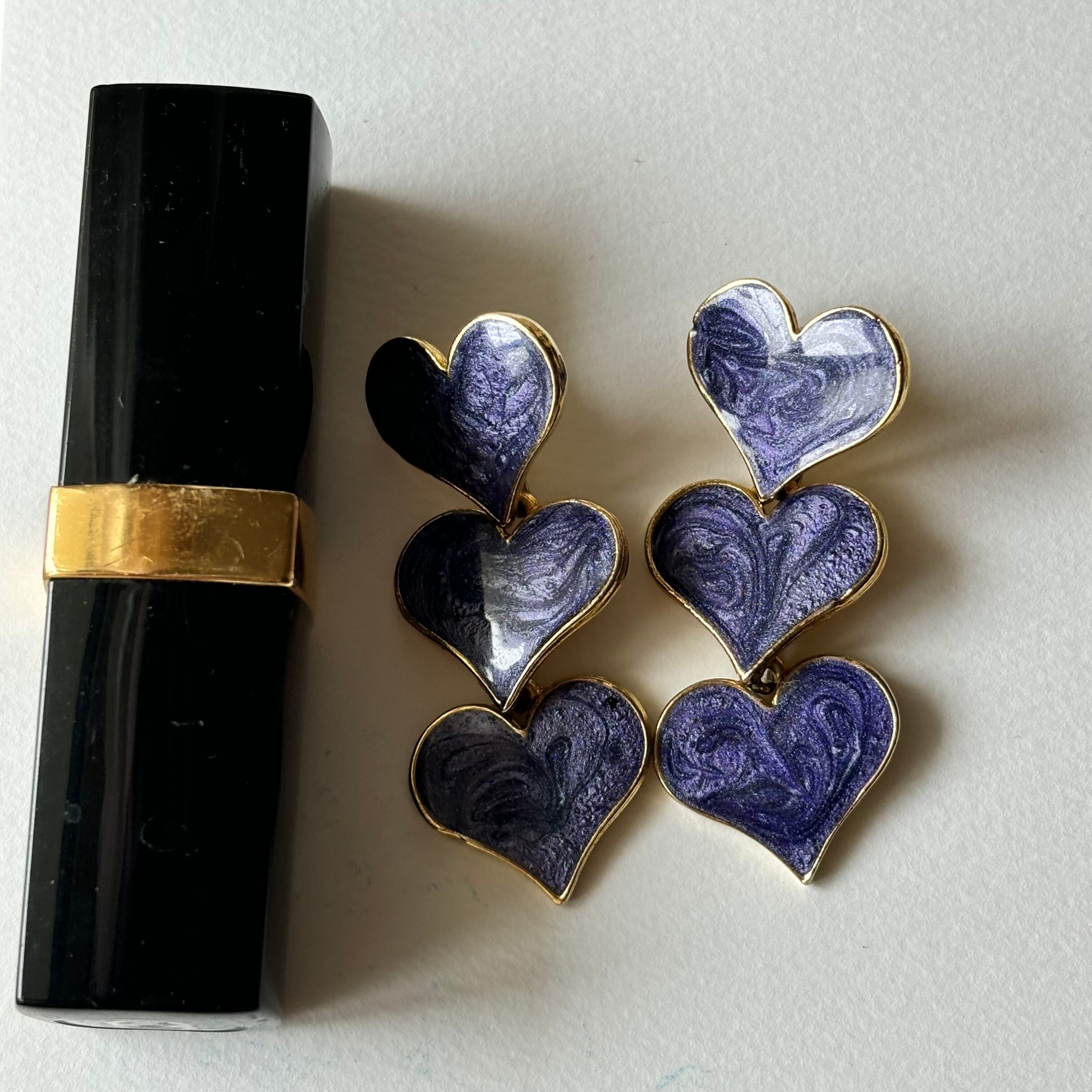 3連ハート×紫のマーブル模様のエナメルのピアスです。ゆらゆら揺れるハートが乙女心をくすぐる逸品です。赤やピンクならありそうですが紫なのが珍しいです。甘すぎず大人の女性にもおすすめです。