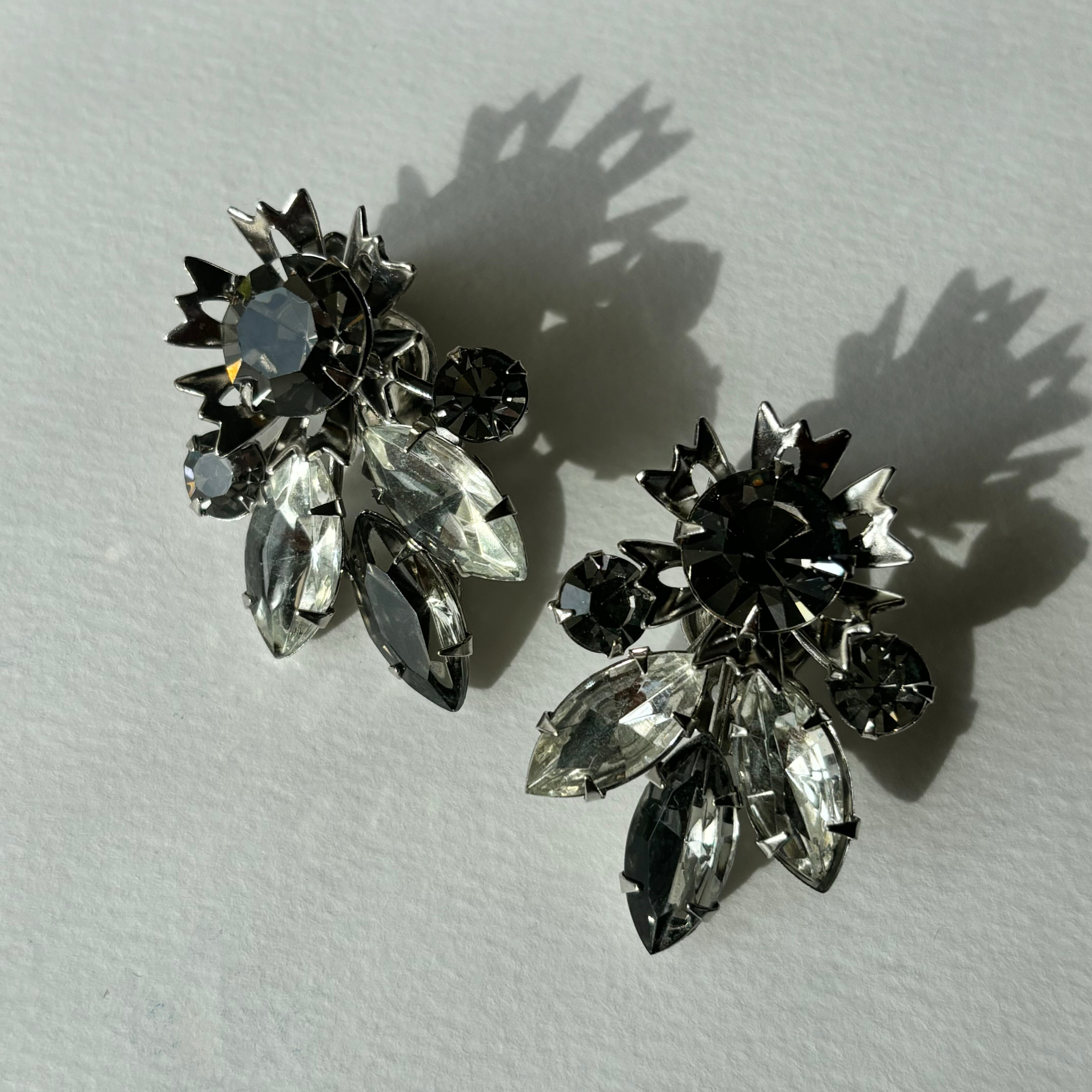 グレー×クリスタルのラインストーンのイヤリングです。暗めのお色なのでコーディネートもシックに決まりますよ。大ぶりで存在感たっぷりの逸品です。