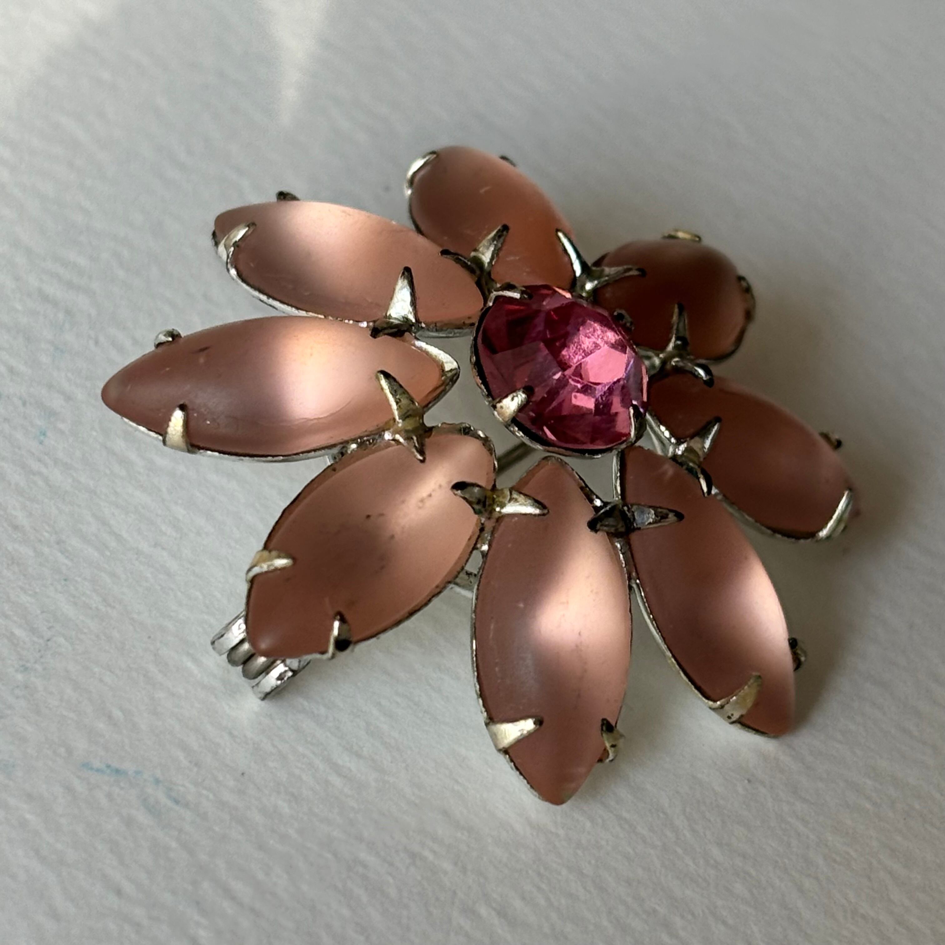 ピンクのフロストストーンがセットされたブローチです。中心は濃いピンクですが周りは落ち着きのある優しいお色味でどんなお洋服にも合いそうです。セレモニーでの使用はもちろん、普段使いの帽子やバッグにも雰囲気が出そうです。白いtシャツに合わせても普段のコーディネートに彩を与えてくれますよ。