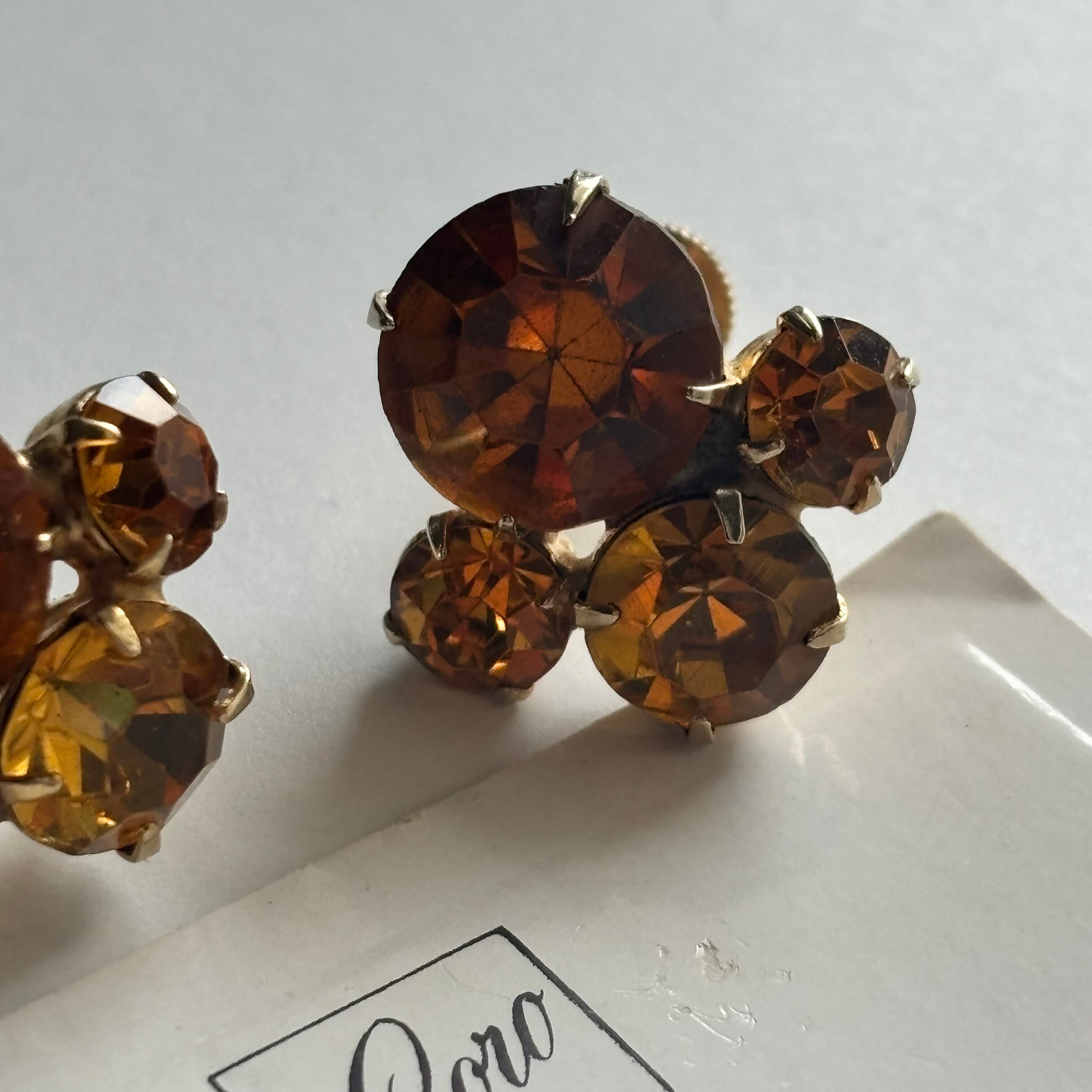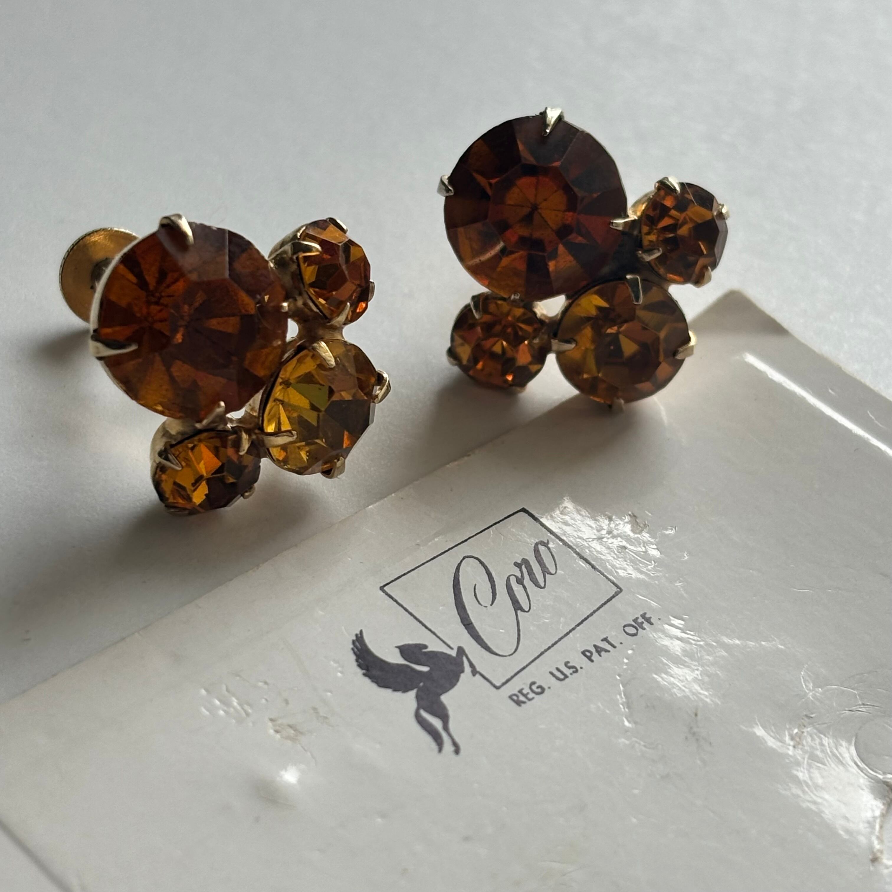 アンバーカラーのビジュがふんだんに使われた華やかなイヤリングです。アメリカのコスチュームジュエリーCOROのアイテムです。ヴィンテージならではの独特な風合いと世界観が非常に美しく魅力的な逸品です。コンディションも良く、プレゼントにもおすすめです。