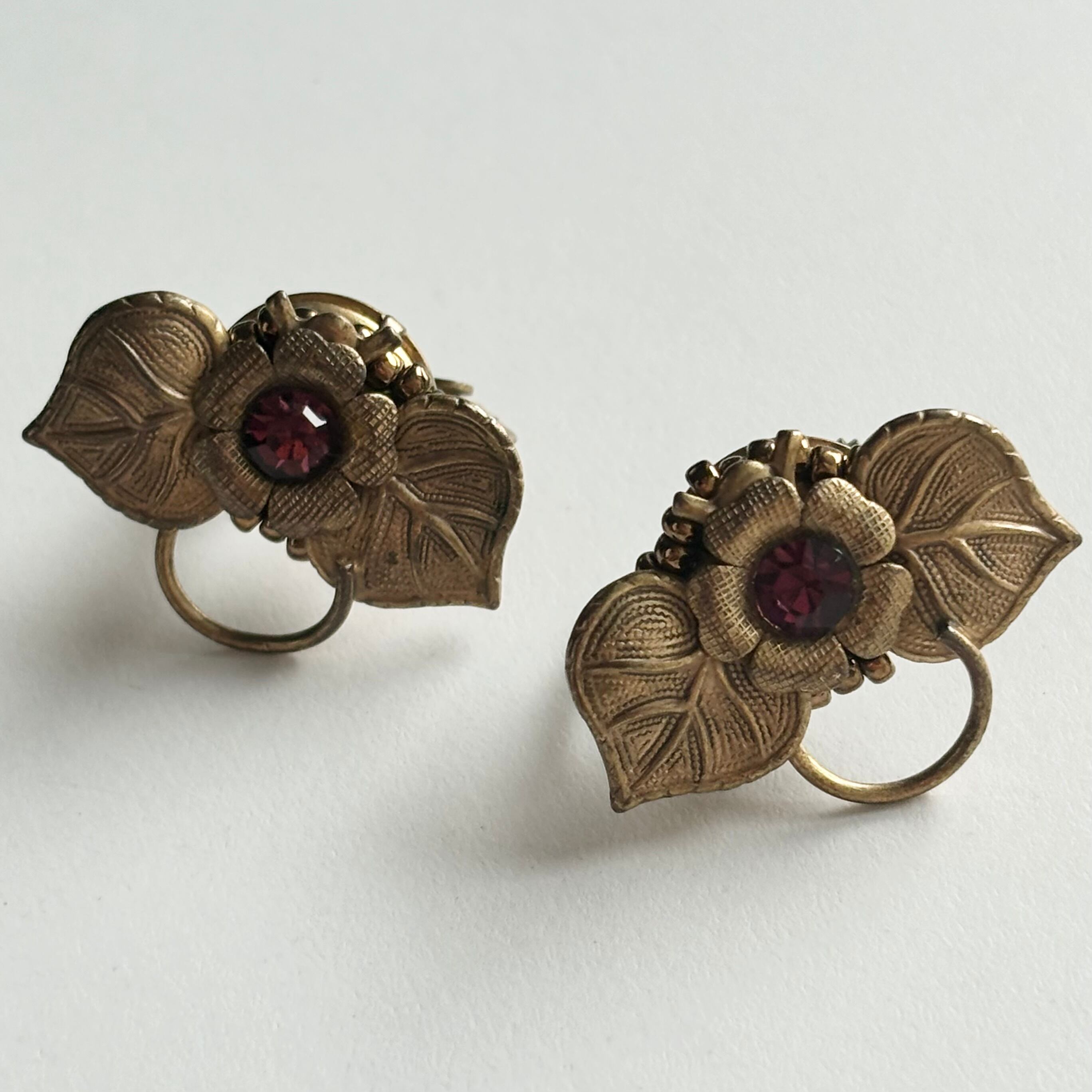 ヴィンテージらしいロマンチックな世界観のイヤリングです。アメジストカラーのストーンがアクセントになっていてより雰囲気が出ています。