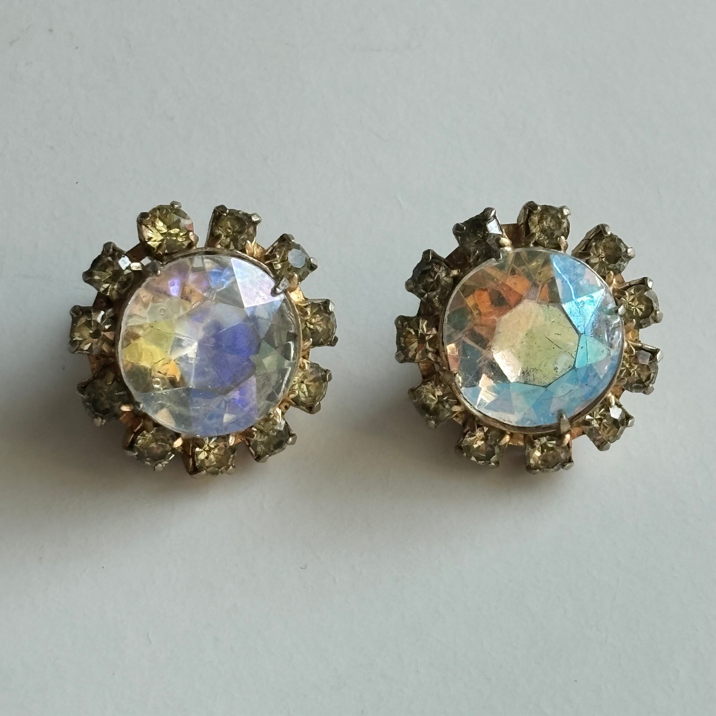 イエロー×オーロラのラインストーンをふんだんに使用した贅沢なイヤリングです。パーティシーンはもちろん普段の服装にポイントとして加えても素敵ですよ。