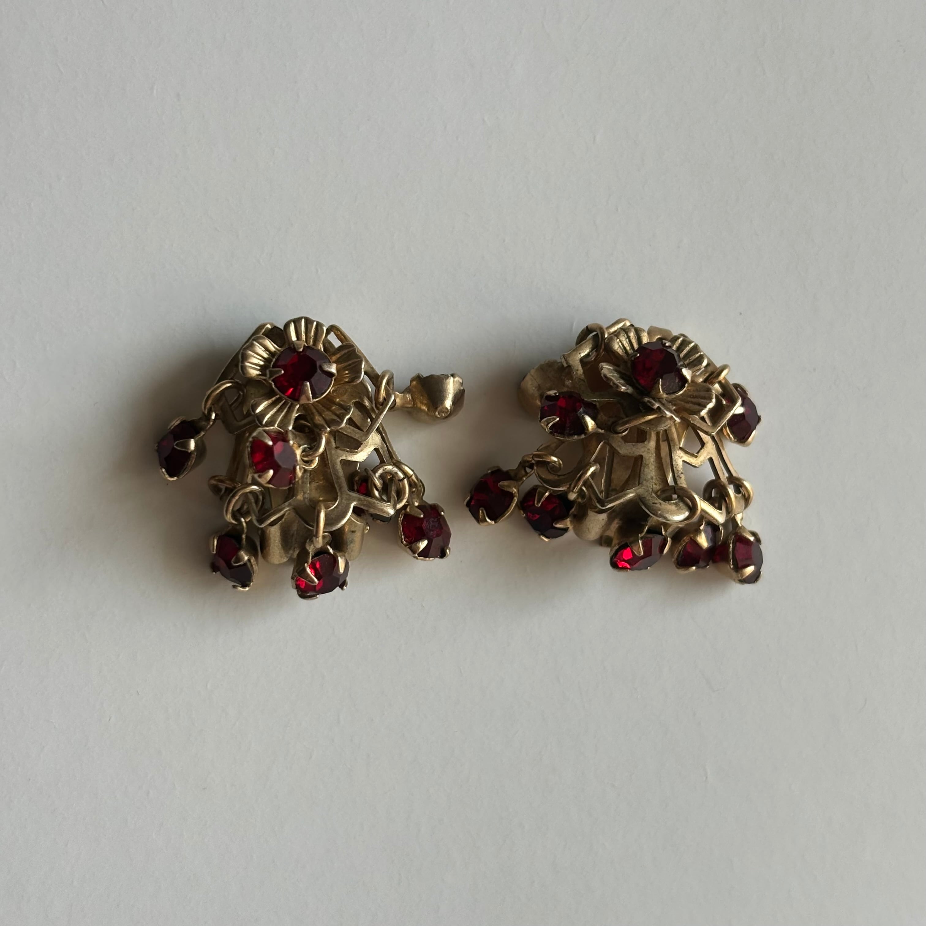 しゃらしゃらと赤のストーンが揺れるデザインのイヤリングです。爪どめなので取れる心配もありません。上部がお花の形になっていたりと、こだわりを感じる逸品です。