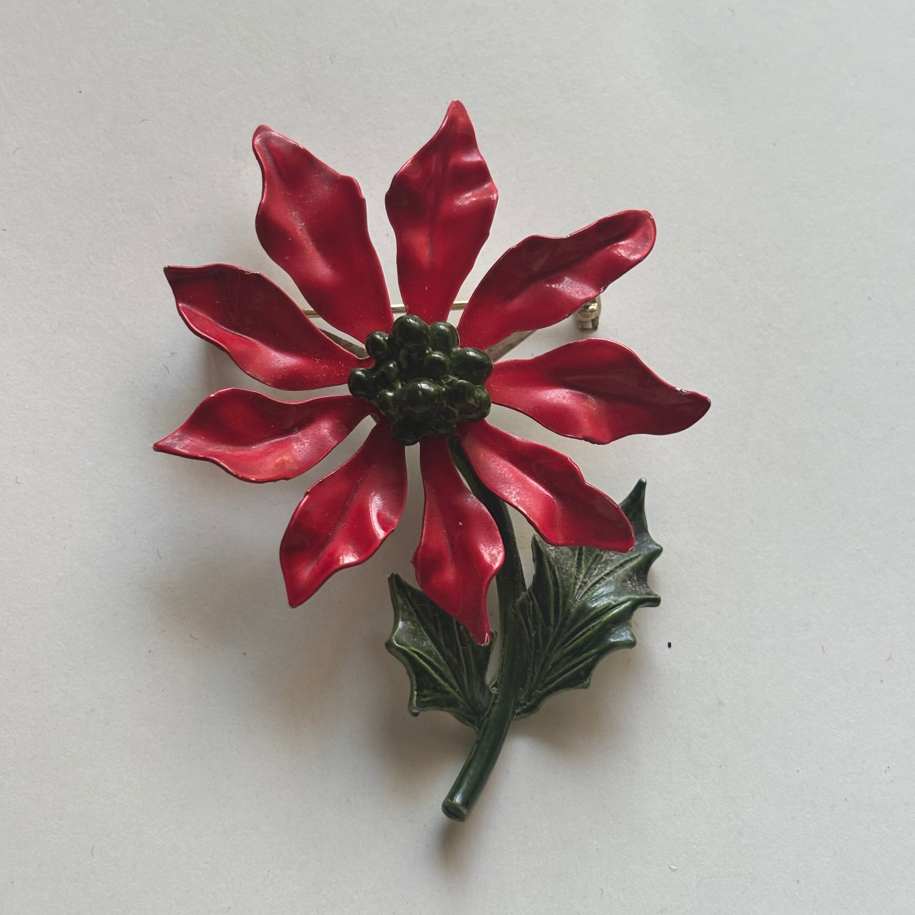 これからの時期にぴったりのクリスマスカラーのブローチです。コートやバッグ、帽子など様々なアイテムに合わせやすいですよ。一つ持っておくだけで気分が高まりますね。