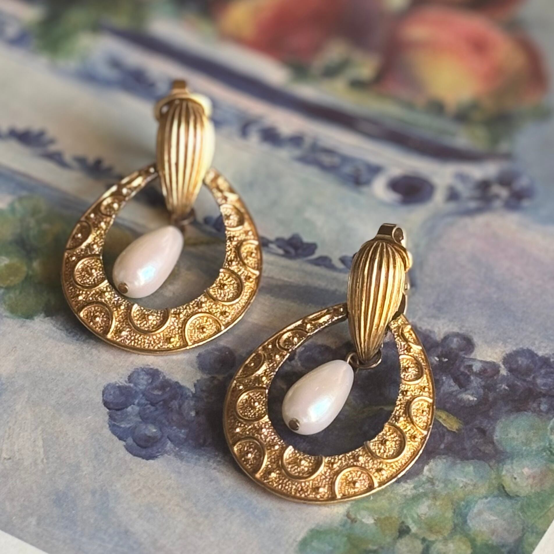 アメリカのコスチュームジュエリーブランドtrifariのイヤリングです。稀少なcrown trifariです。trifariらしい堂々としたただずまいで、モダンかつシックな逸品です。パールが揺れるのも魅力です。