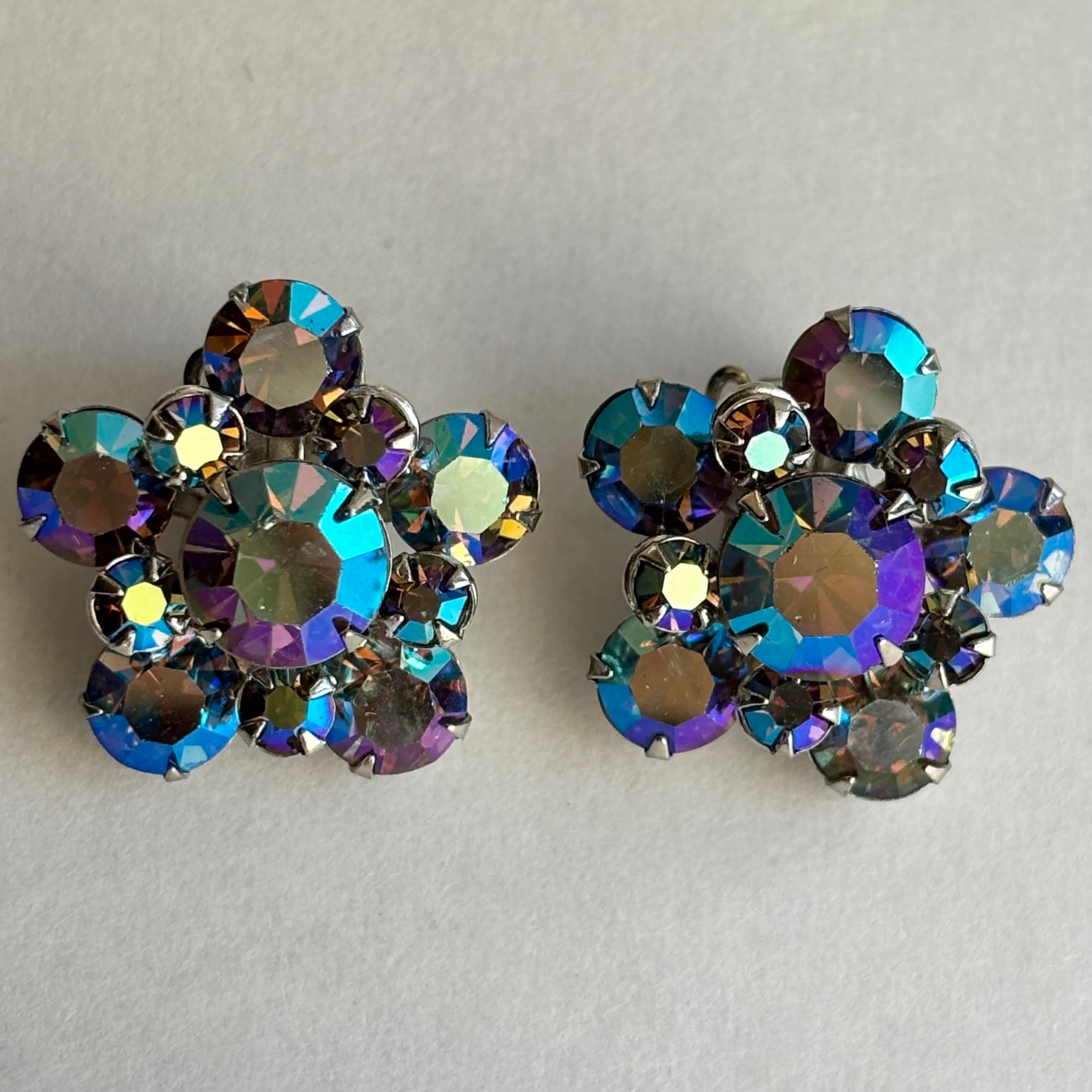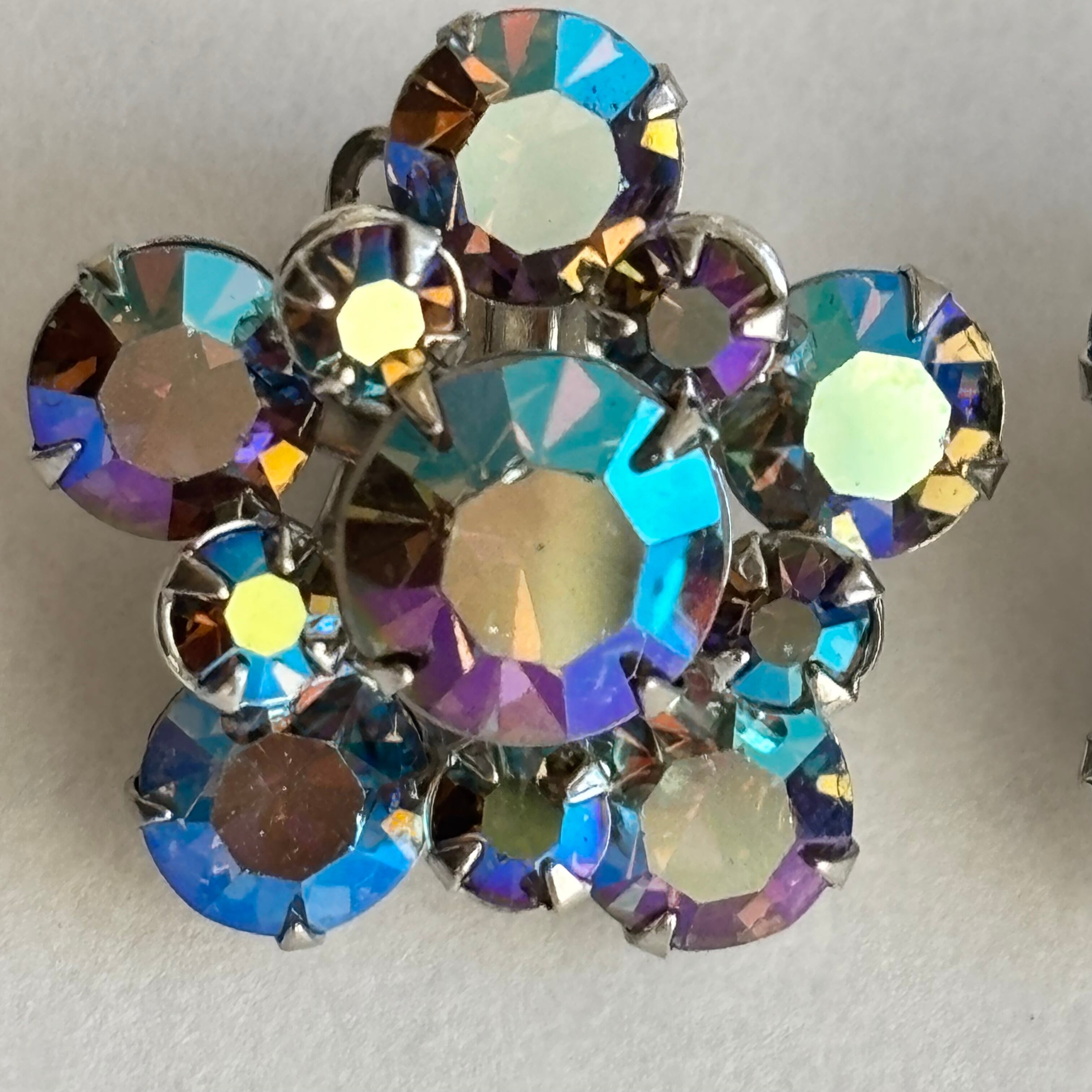 ラインストーンのイヤリングです。ブルーにオーロラのような加工が施されたラインストーンが、キラキラと眩いくらいの輝きがあります。