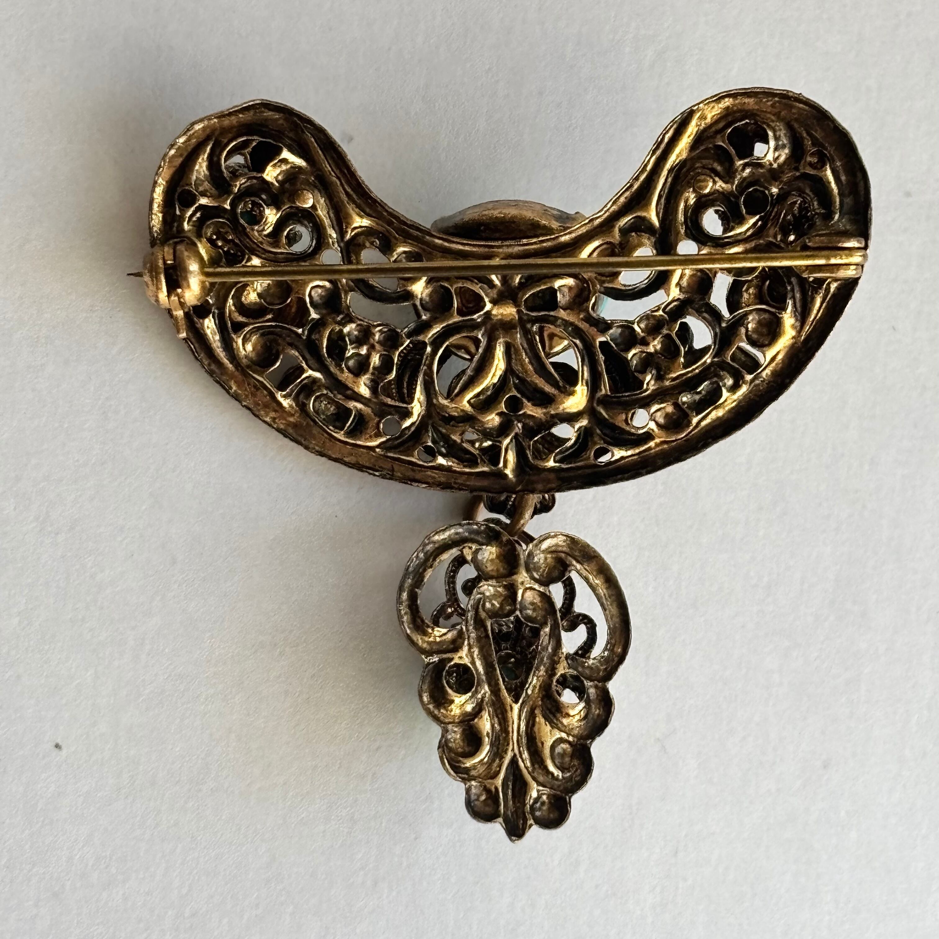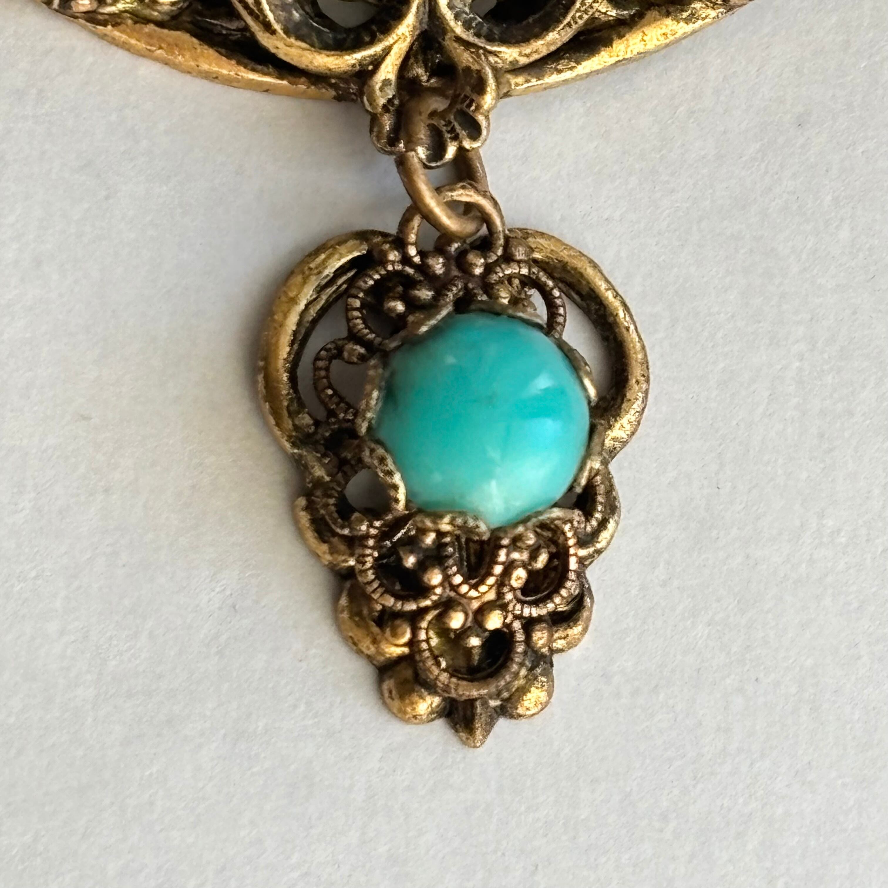 ターコイズカラーのカボションと透かし装飾台座のコンビが非常に美しいブローチです。下のパーツがゆらゆらと揺れるのもデザイン性が高く、うっとりとしてしまいますね。ヴィンテージらしい世界観が魅力的な逸品です。