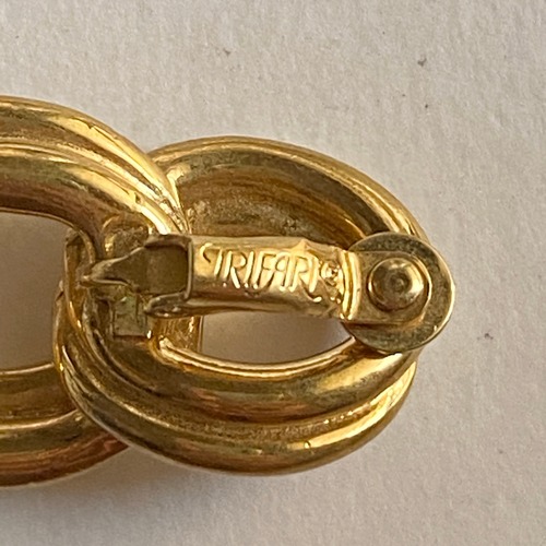 トリファリは1918年にグスタボ・トリファリ氏とレオ・クラウスマン氏によりTrifari and Krussman Companyとして創業、1925年にカール・フィシェル氏が加わり会社名をTrifari Krussman and Fishel に変更しました。1930年から68年までは高級有名宝飾店ヴァン・クリーフやカルティエに在籍していたアルフレッド・フィリップ氏がヘッドデザイナーとして活躍、クオリティーの高い作品を生み出し、アメリカでも有数のメーカーに成長しました。優美な曲線を多用した上品でエレガントなデザインは現在でも変わらない魅力です。
