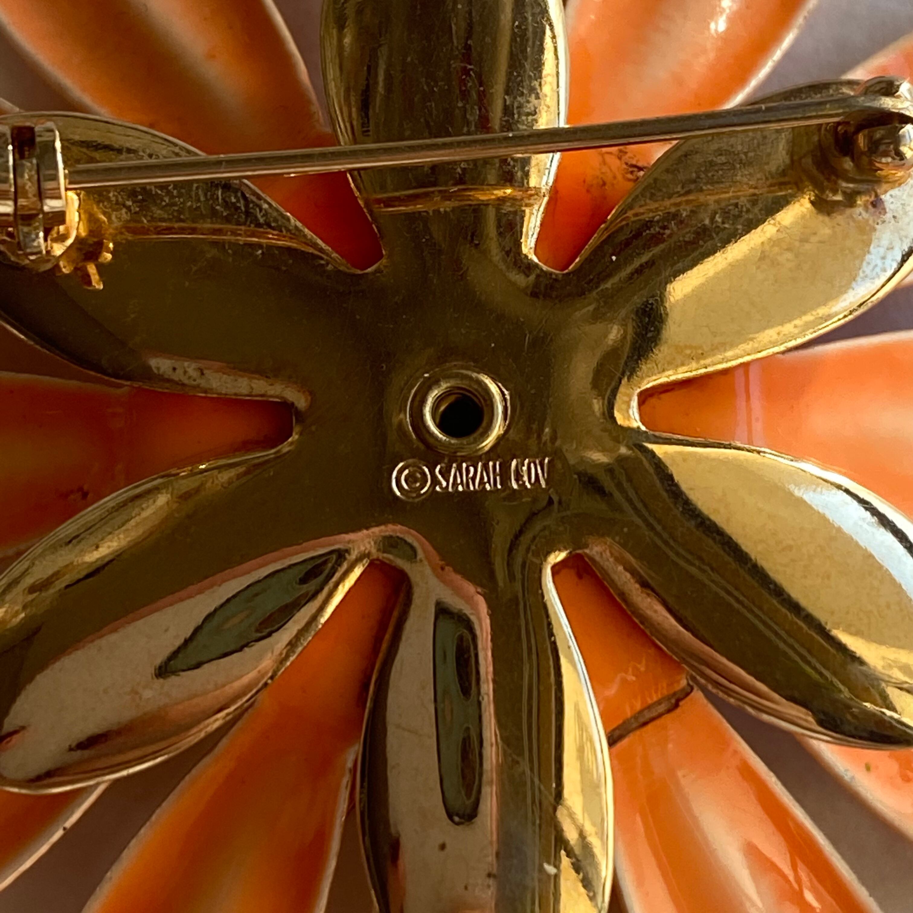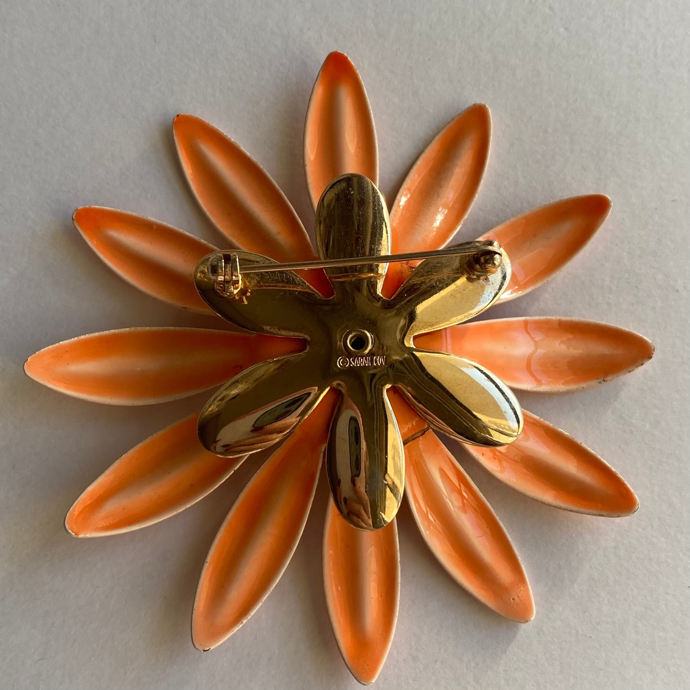 70年代のSarah Coventryのオレンジのフラワーブローチです。大振りで大胆でインパクトがありますが、シエナオレンジのような淡く優しいオレンジのグラデーションが上品な逸品です。