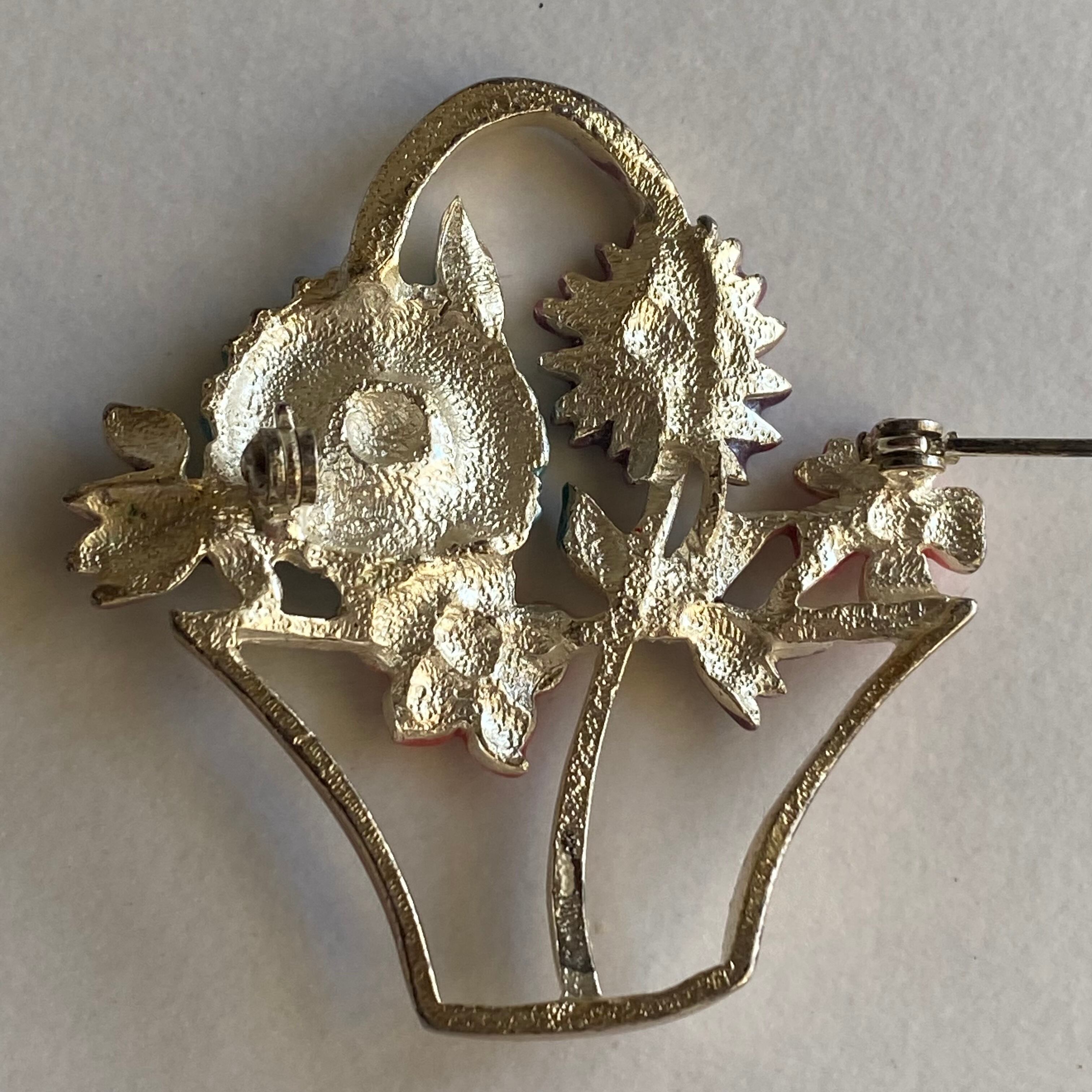 様々な色のフラワーが顔を出すバスケットがモチーフのブローチです。シンプルなメタルのバスケットとペイントされたフラワーのコントラストが非常に女性らしい逸品です。