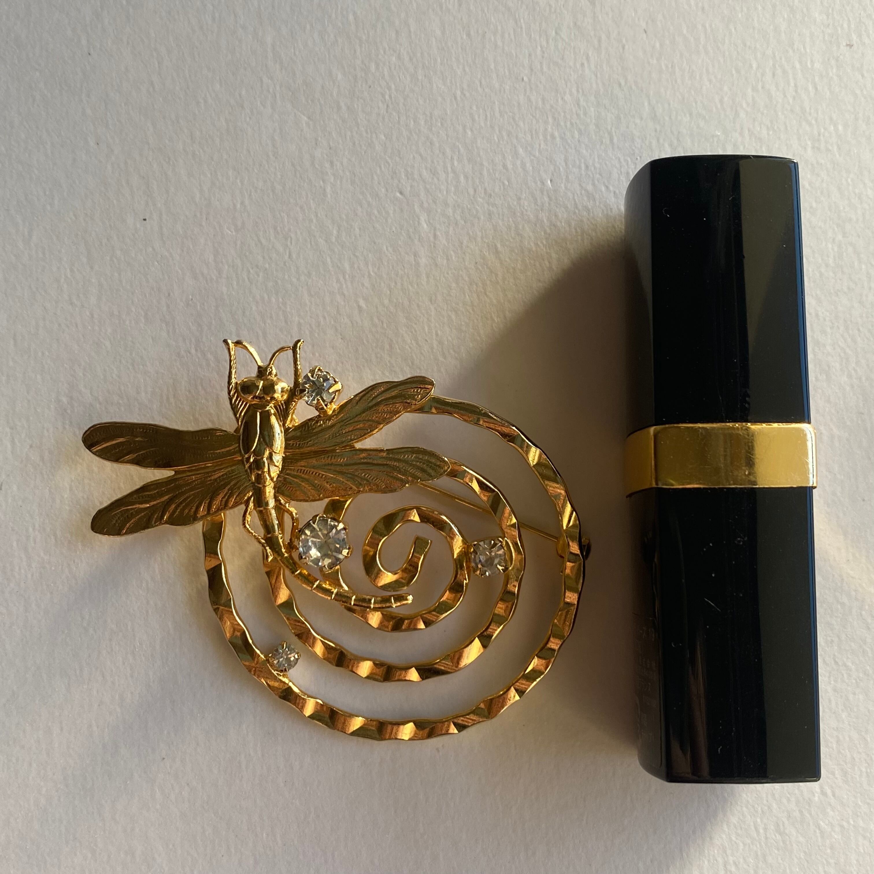 ゴールドトーンメタルのトンボが渦巻きにとまっているブローチです。大小様々なラインストーンがきらりと光り、どことなく華やかさを演出しています。