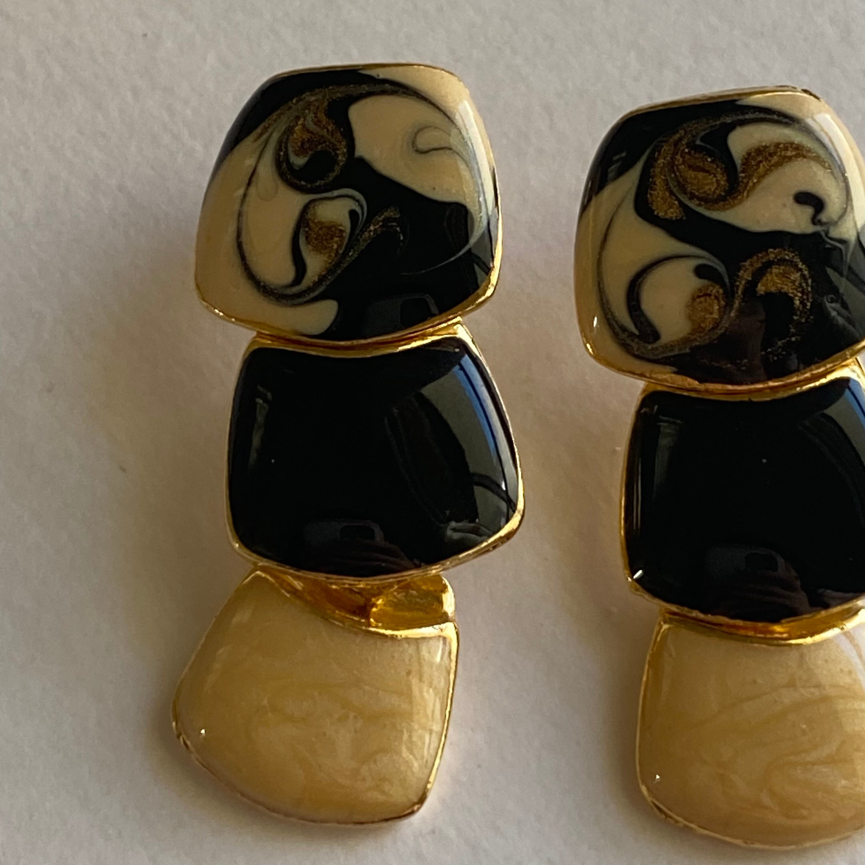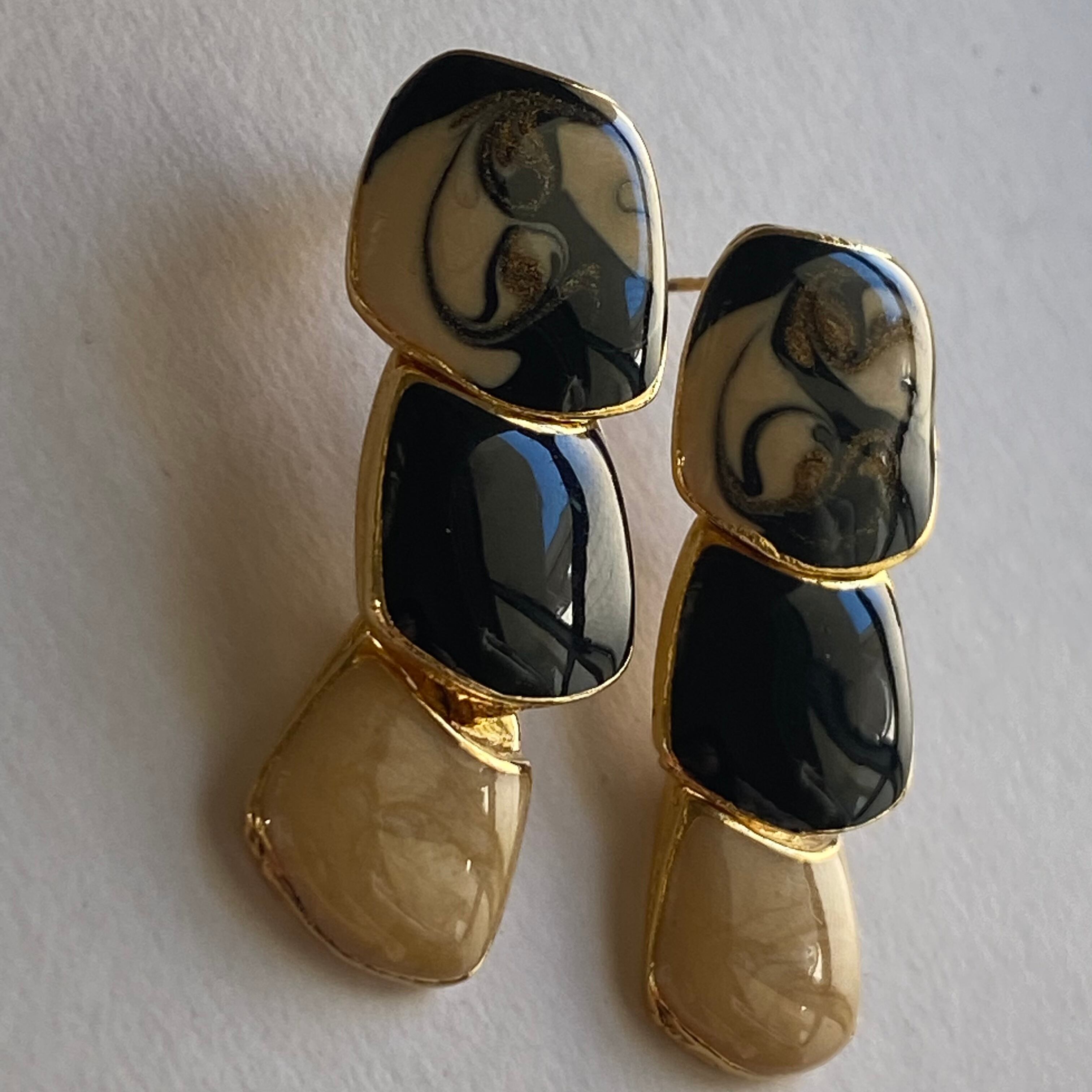 マーブルエナメル、ブラック、アイボリーのマーブルエナメルの3つ連なったロングタイプです。縁取るゴールドとの組み合わせもマッチしており、個性的ですがどこかモダンな逸品です。