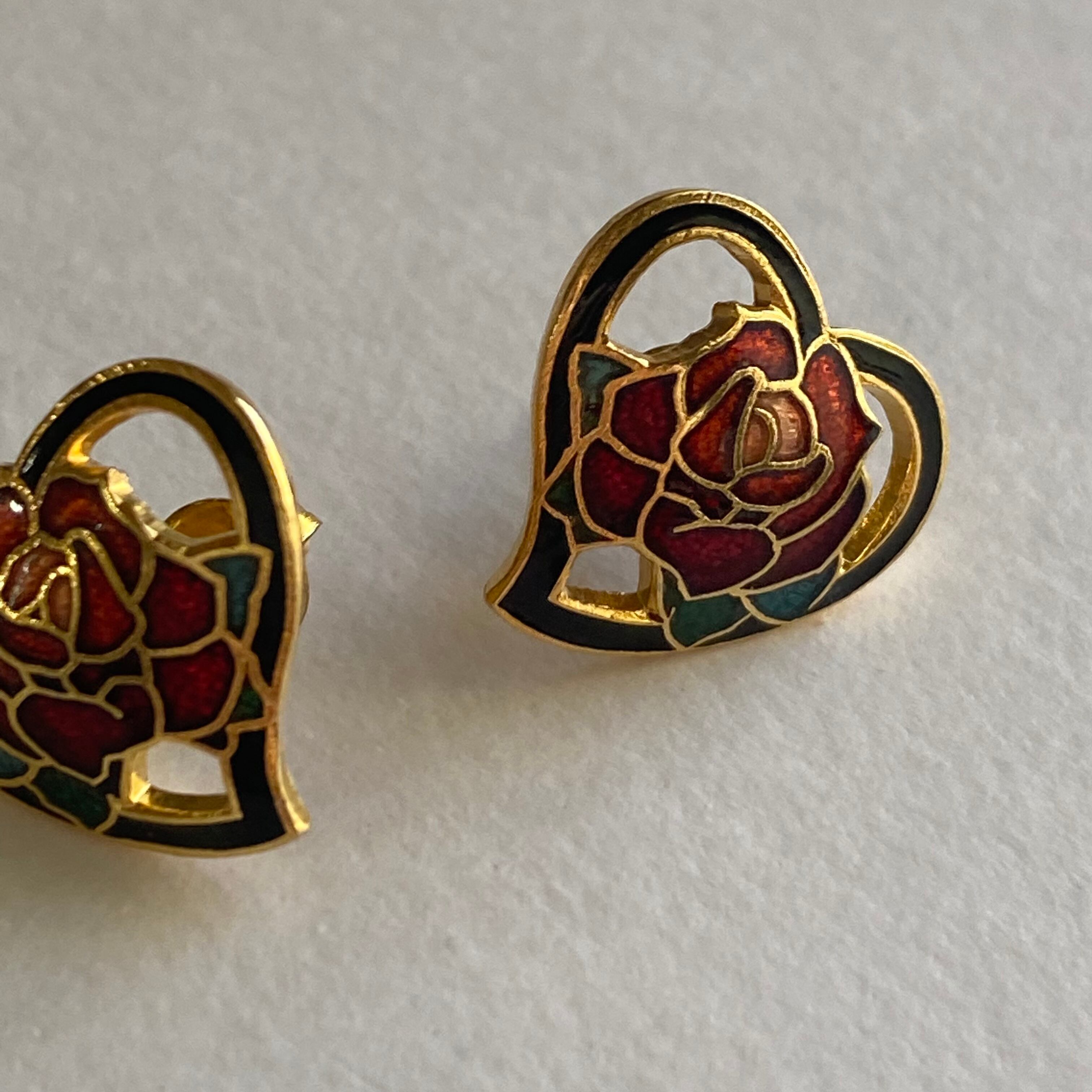 ハートベースに赤のクロワゾネエナメルの薔薇が凛と咲いているピアスです。