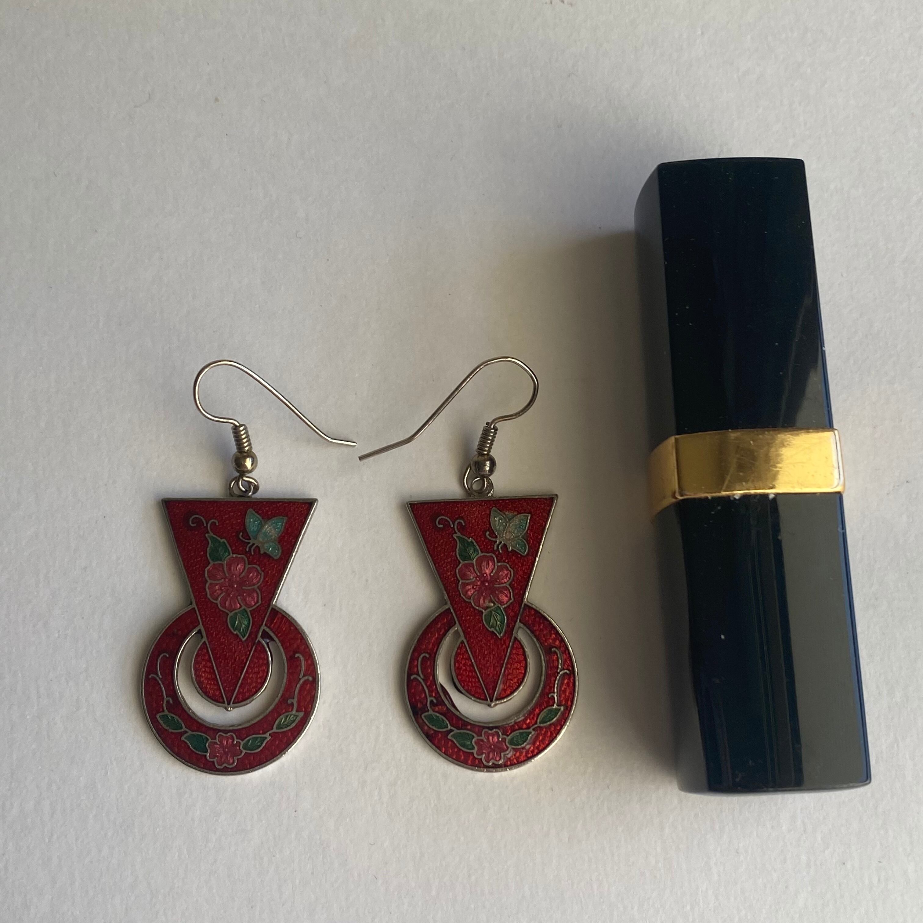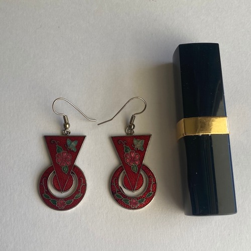 七宝焼のピアスです。トライアングル×ラウンドの赤ベースに赤い花が咲き、蝶が寄ってきているデザインです。オリエンタルな雰囲気が他にはない個性的な世界観を出しております。