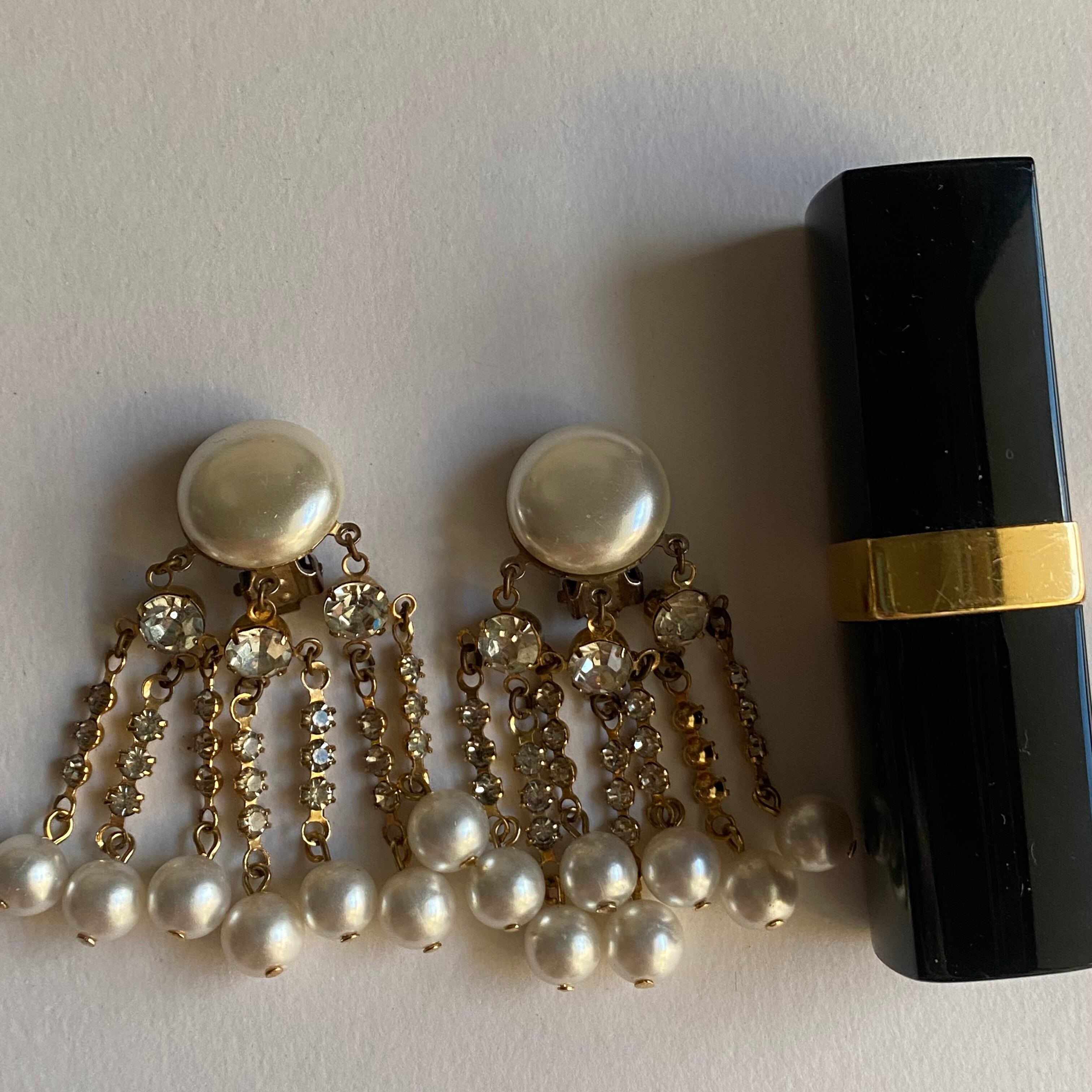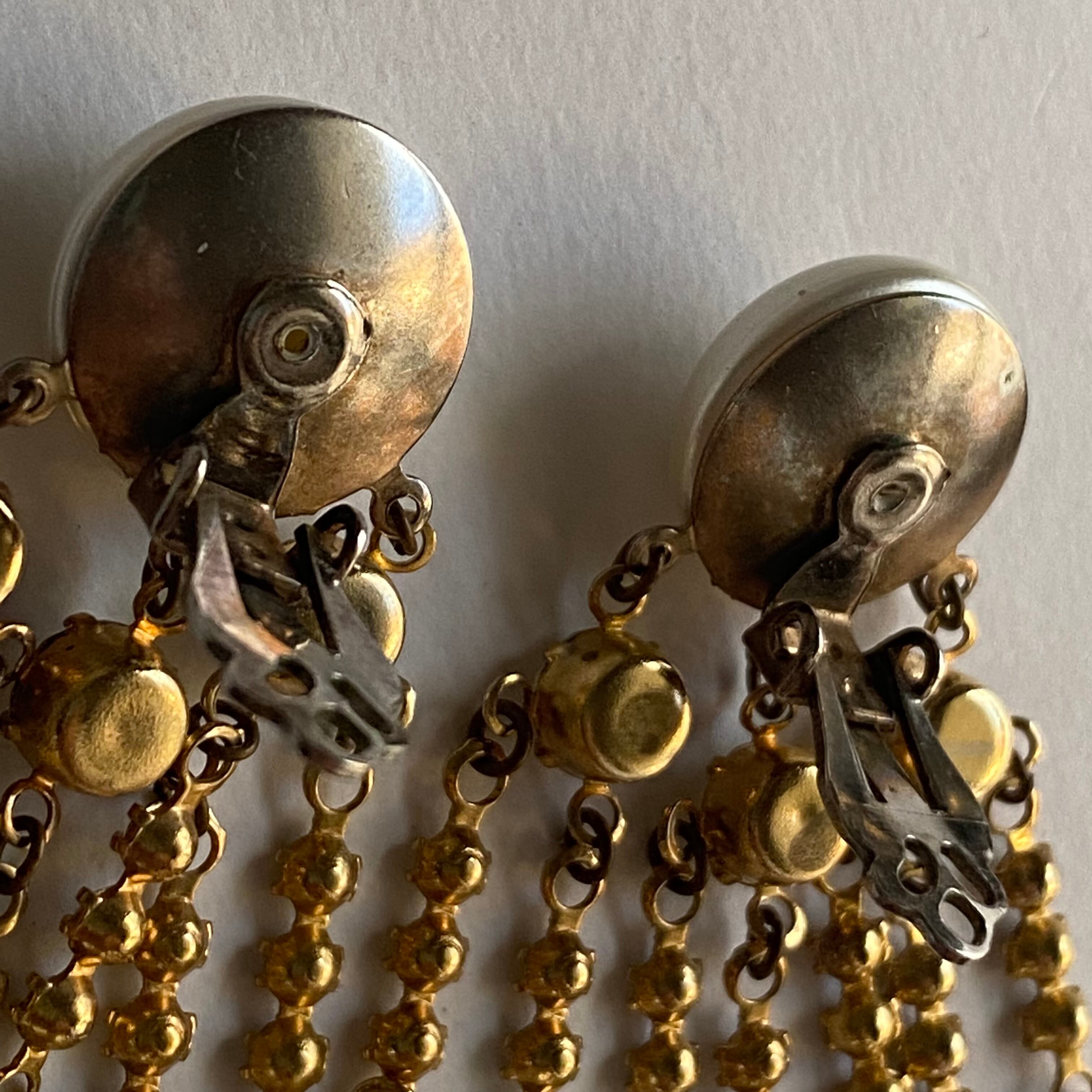 大振りのパールの下でラインストーン×パールがスイングするデザインです。ヴィンテージならではのパーツ使いが圧巻の上品さです。ヴィンテージラインストーンの鈍い輝きが現代のラインストーンとはまた違った雰囲気があり、堂々とした佇まいです。