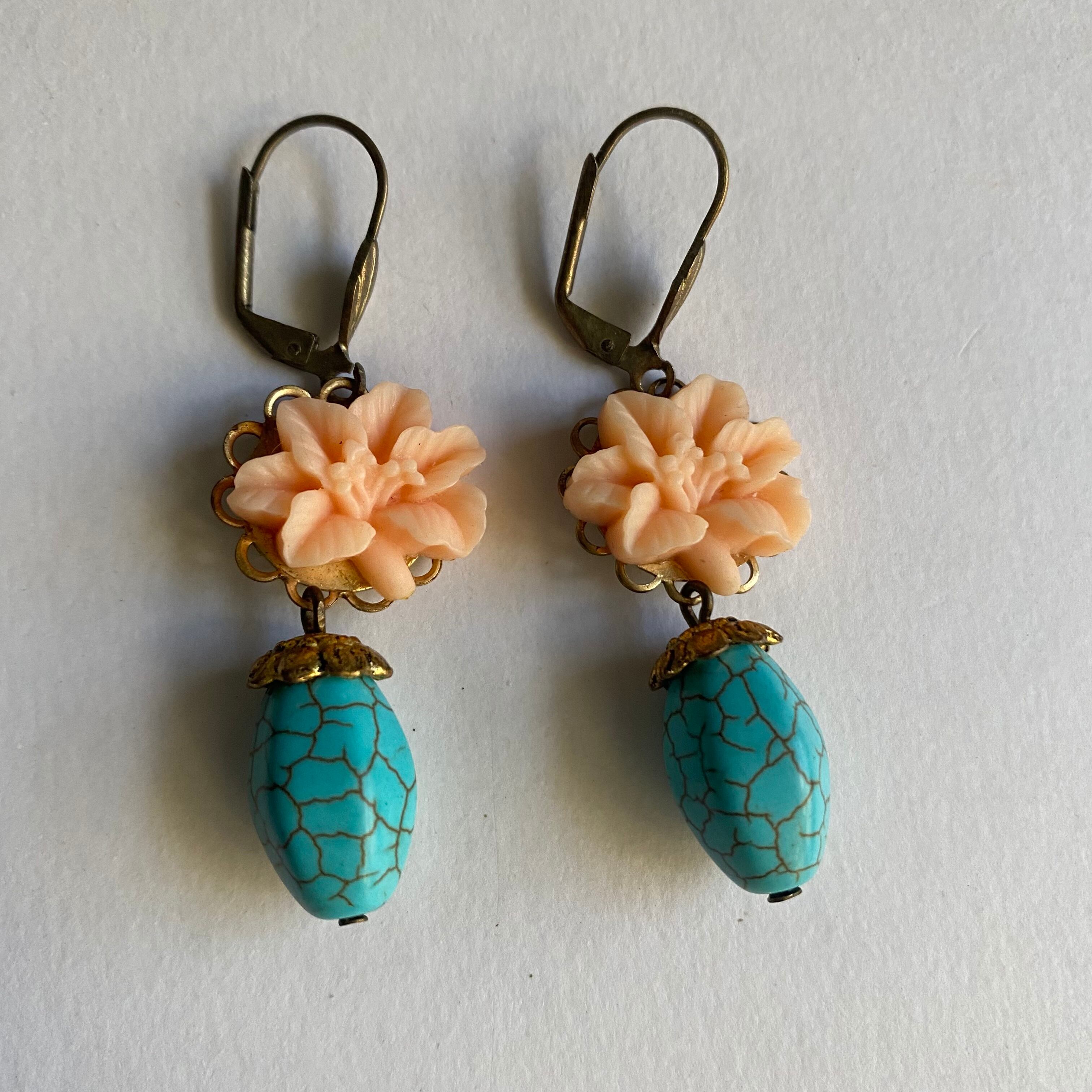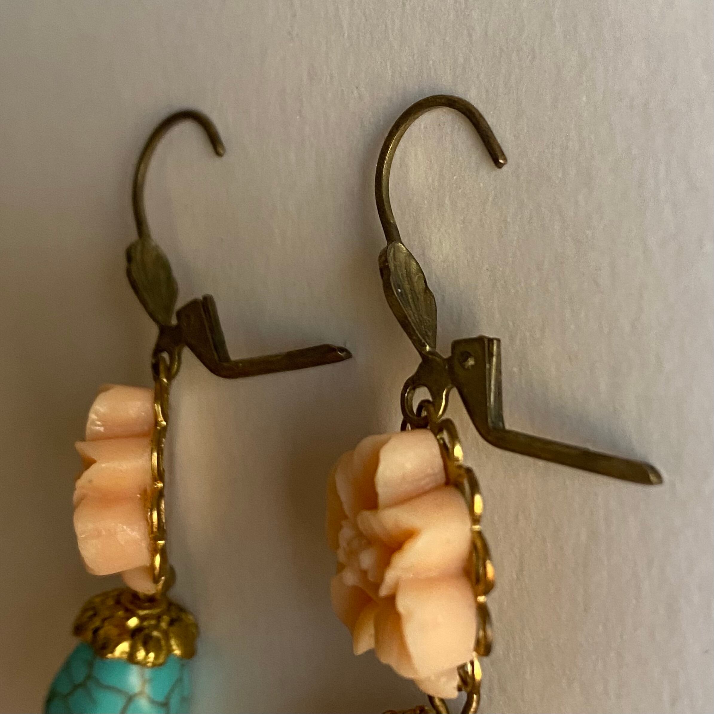 オーロラオレンジのフラワーの下でターコイズ風のパーツがスイングするデザインのピアスです。