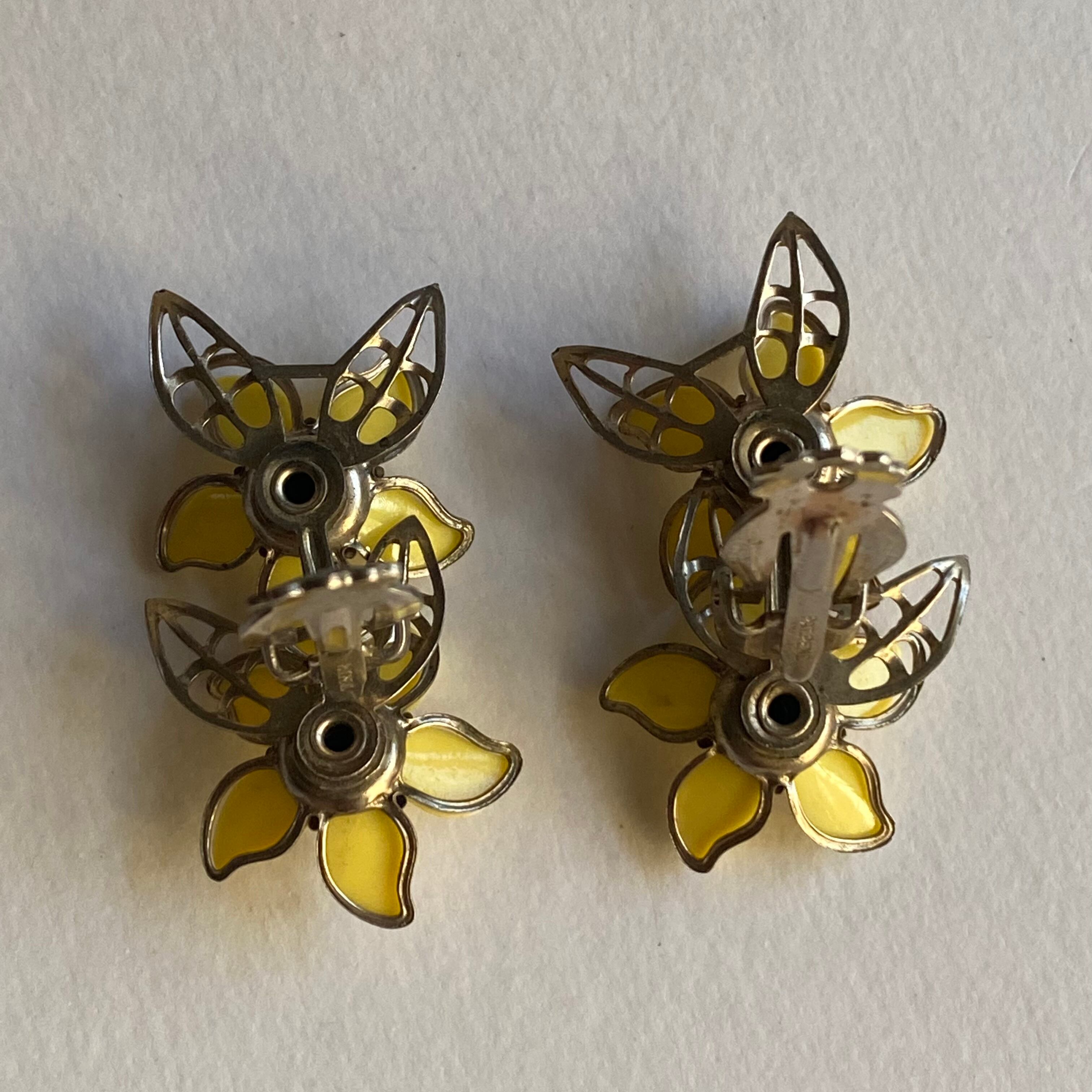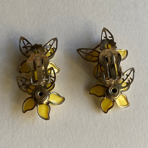 イエローやレモンカラーのイヤリングはありますが、このダンディライアンは他には見ないような独特の色味です。ダンディライアンの花びらにタンジェリンのラインストーンがマッチしており、イエローの持つアクセントさを落ち着いてオレンジで和らげているのでどことなく優しい雰囲気ですね。ヴィンテージの装いにもぴったりですし、シンプルな装いにもグッと雰囲気が出る逸品です。