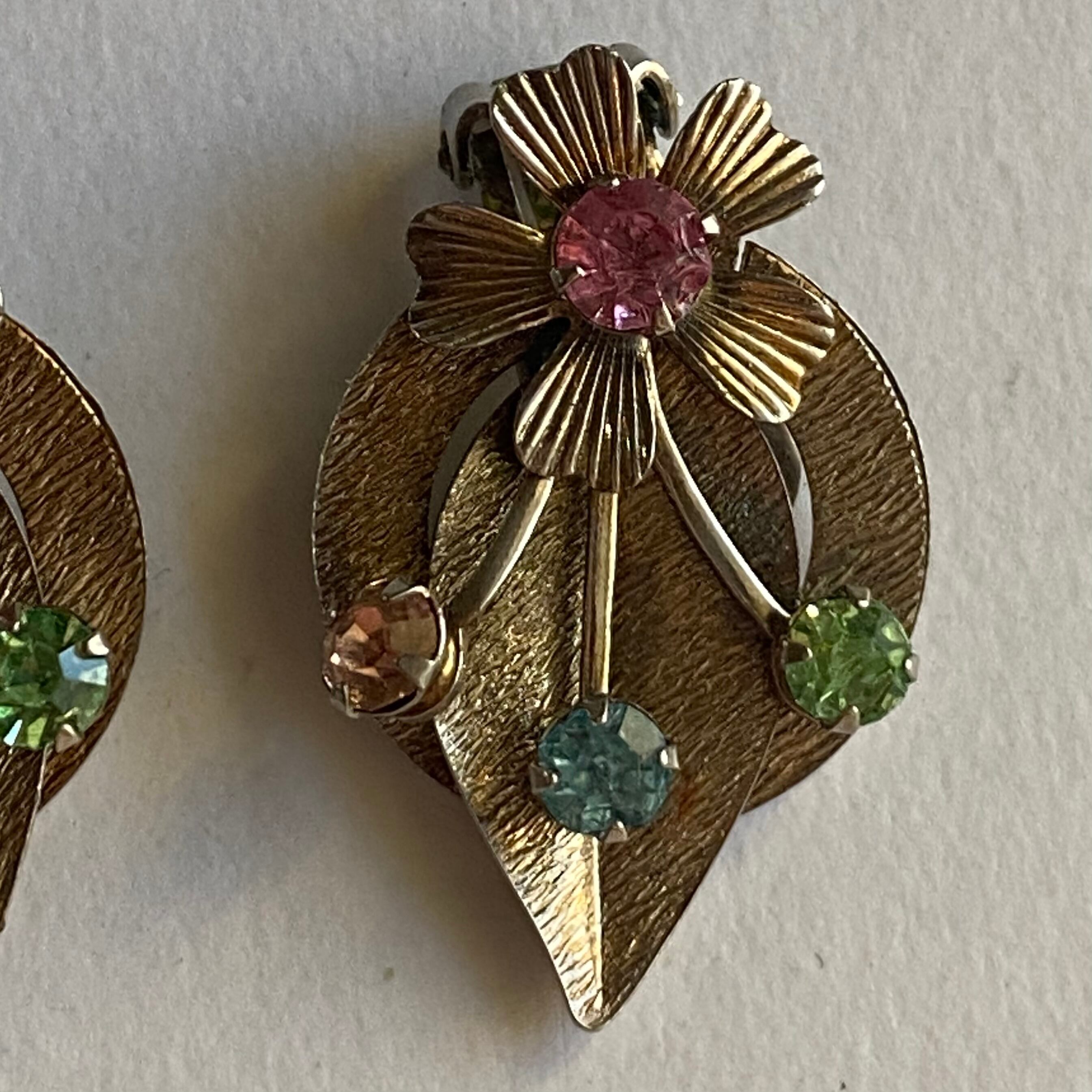 カラフルなラインストーンとメタルで仕立てられたイヤリングです。お花から蔦が生えたようなデザイン。