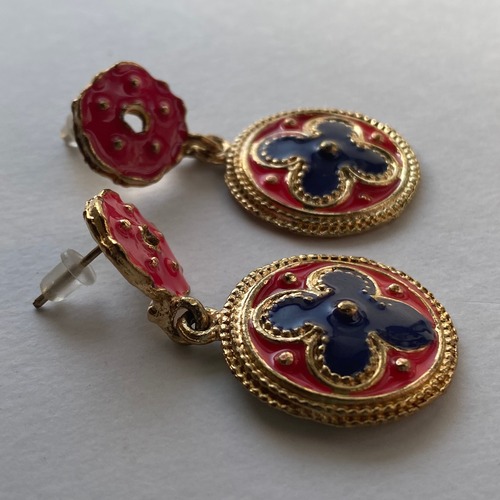 カーマイン×パープルエナメルで仕立てられたピアスです。パープルエナメルの四葉モチーフパーツがスイングするデザインです。エナメル独特の艶のある表情と色味が印象に残ります。