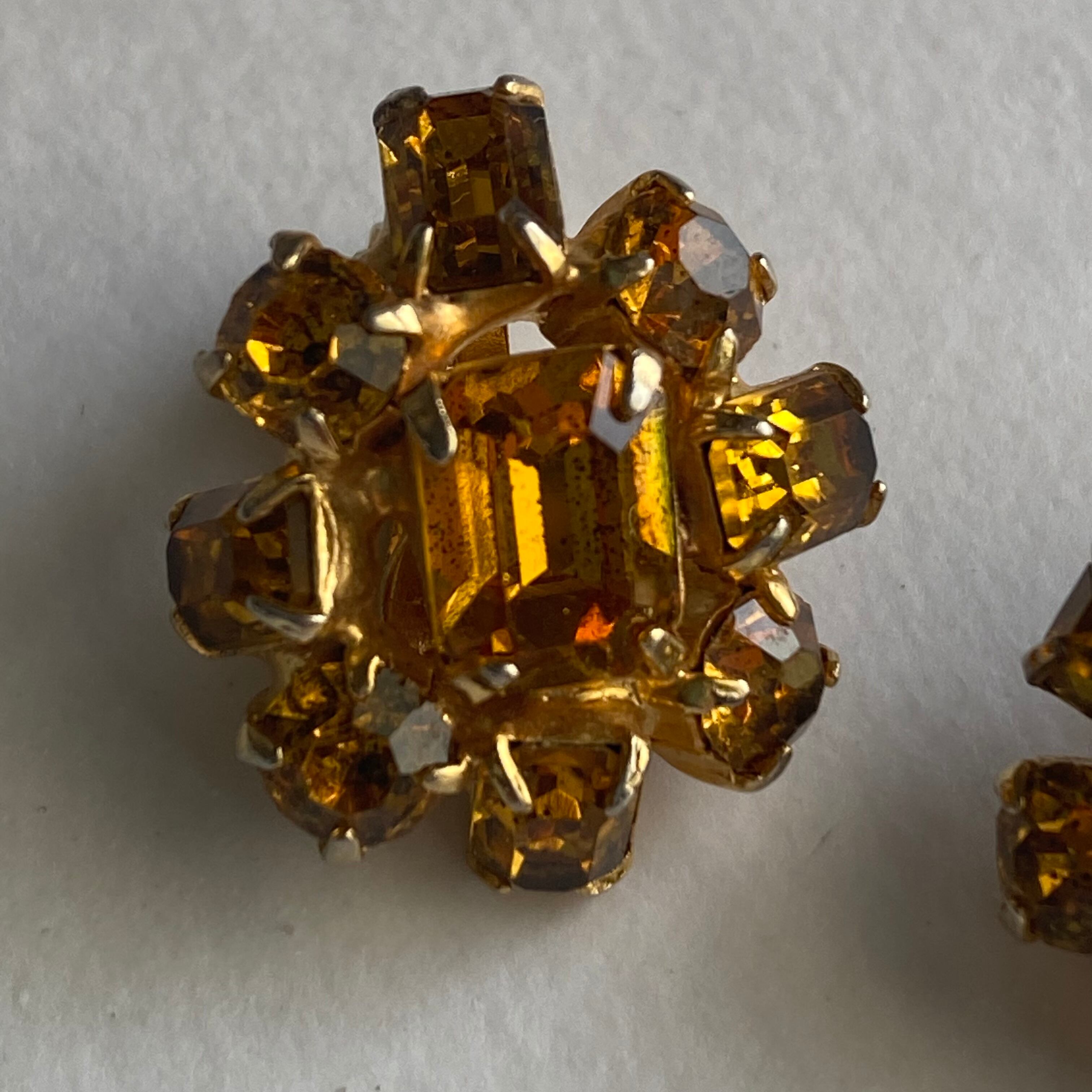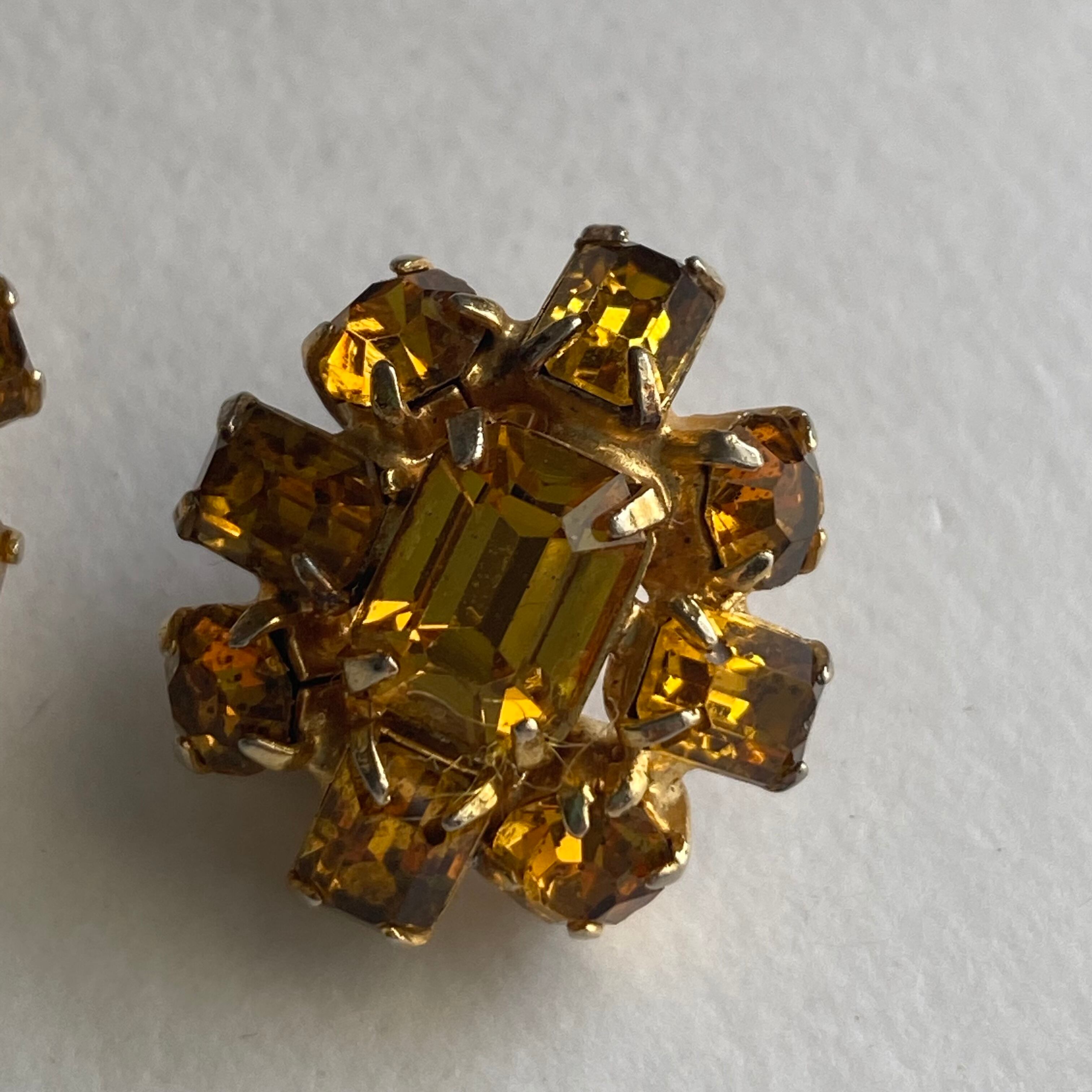 ブラウンのラインストーンで仕立てられたイヤリングです。光に当たると若干オレンジのような輝きがあり単調ではないラインストーンの良さが引き立っています。。(5枚目)後ろの留め具にもレースのような彫りがありこだわりを感じる逸品です。小ぶりなサイズ感が付けやすいのもポイントです。