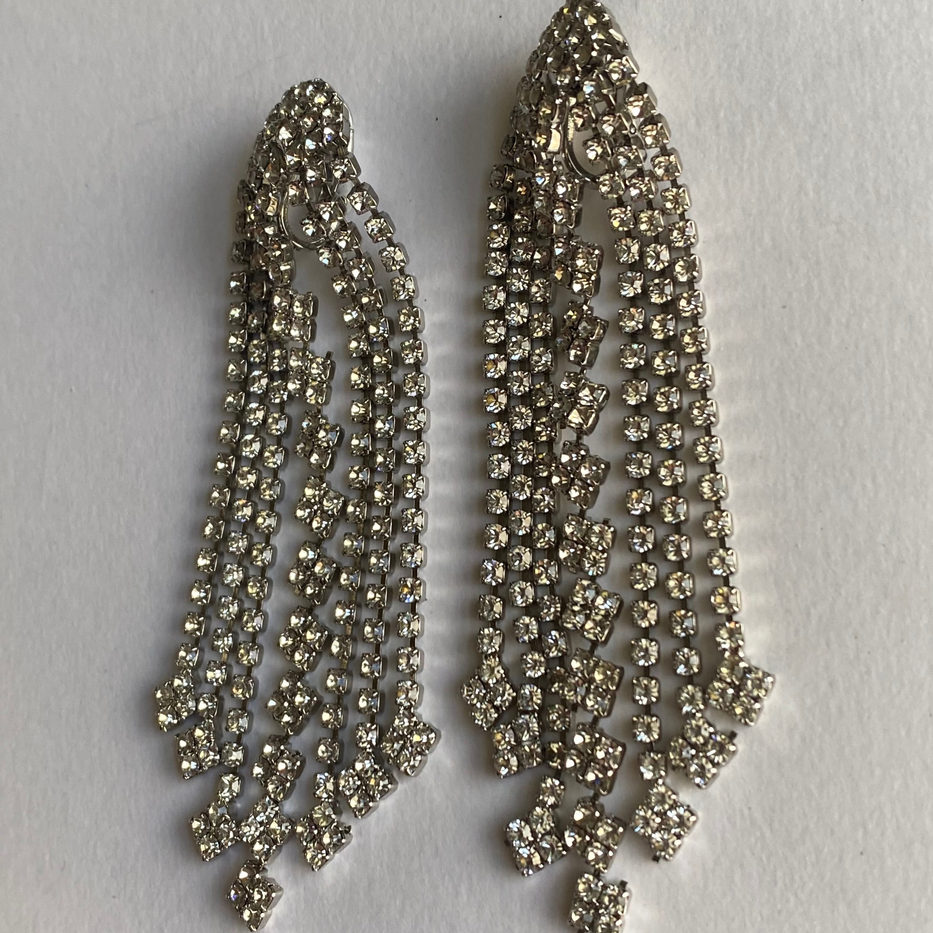 横に目安で置いているCHANELの口紅よりも大きく、サイズ感もバッチリです。センターと先端はラインストーンの連なりでスクエアをかたどっており他のラインストーンのイヤリングとは一味違います。