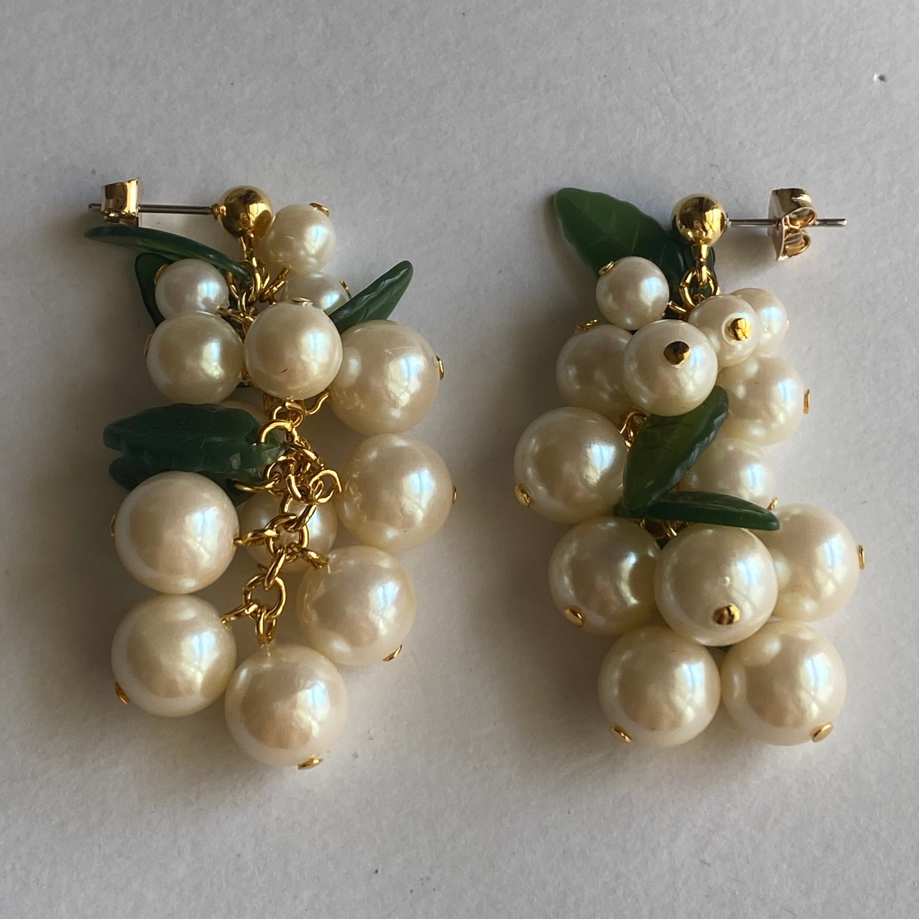 パール×プラスチックのグレープモチーフのピアスです。パールが軽やかにスイングするデザインで、アップスタイルが多い夏にぴったりです。