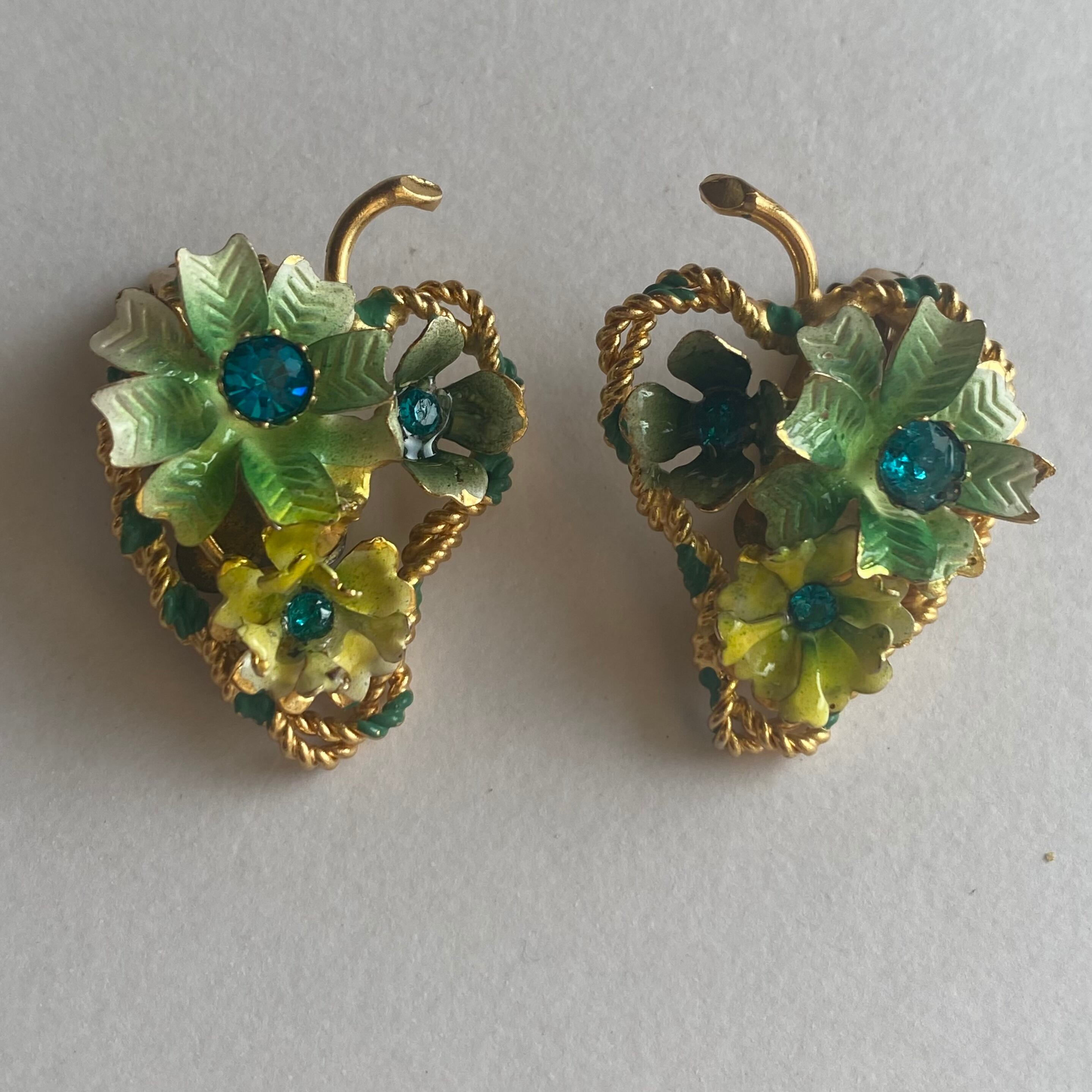 グリーン×イエローのペイントが印象的なフラワーモチーフのオーストリアのイヤリングです。中心はブルーのラインストーンで仕立てられておりロマンチックな逸品です。