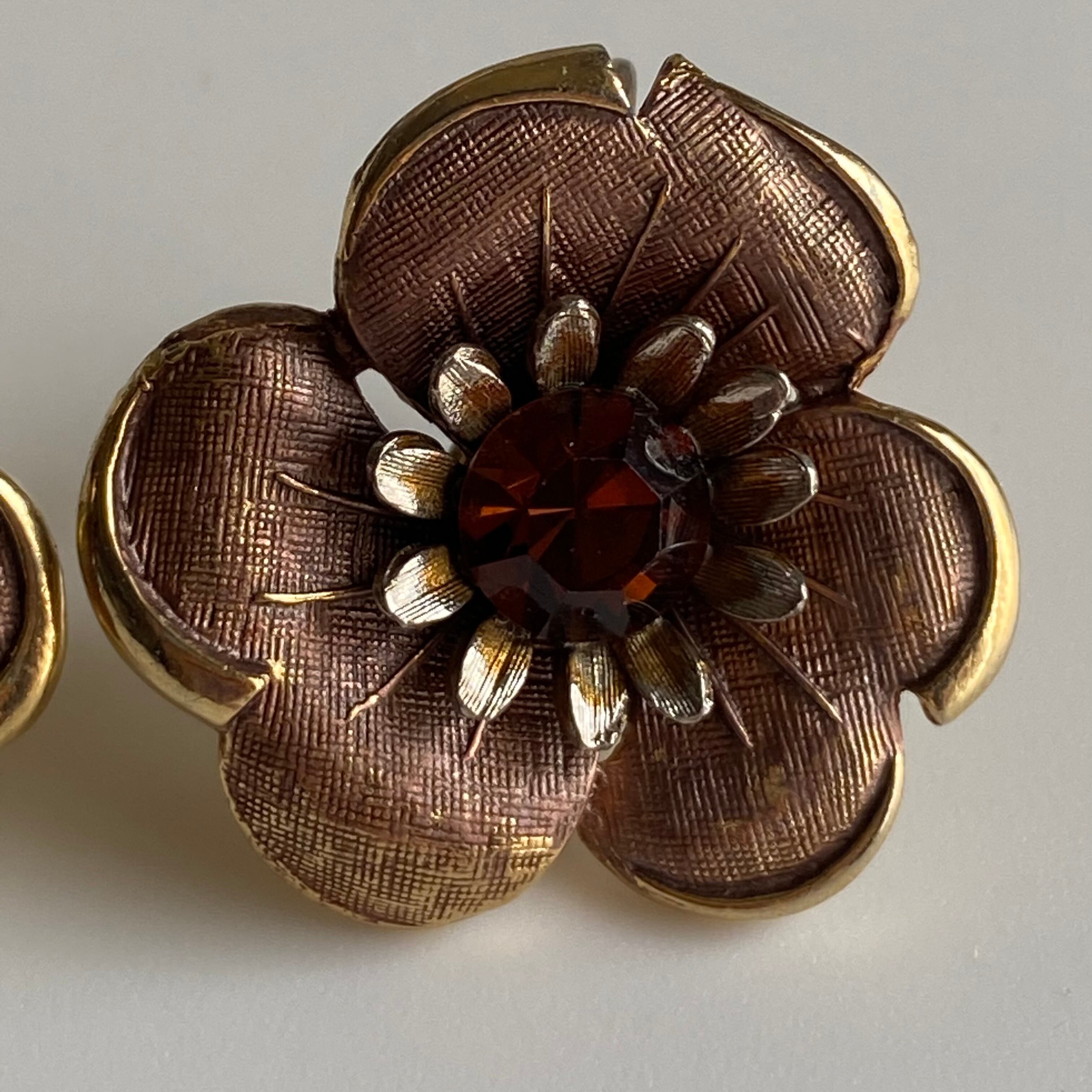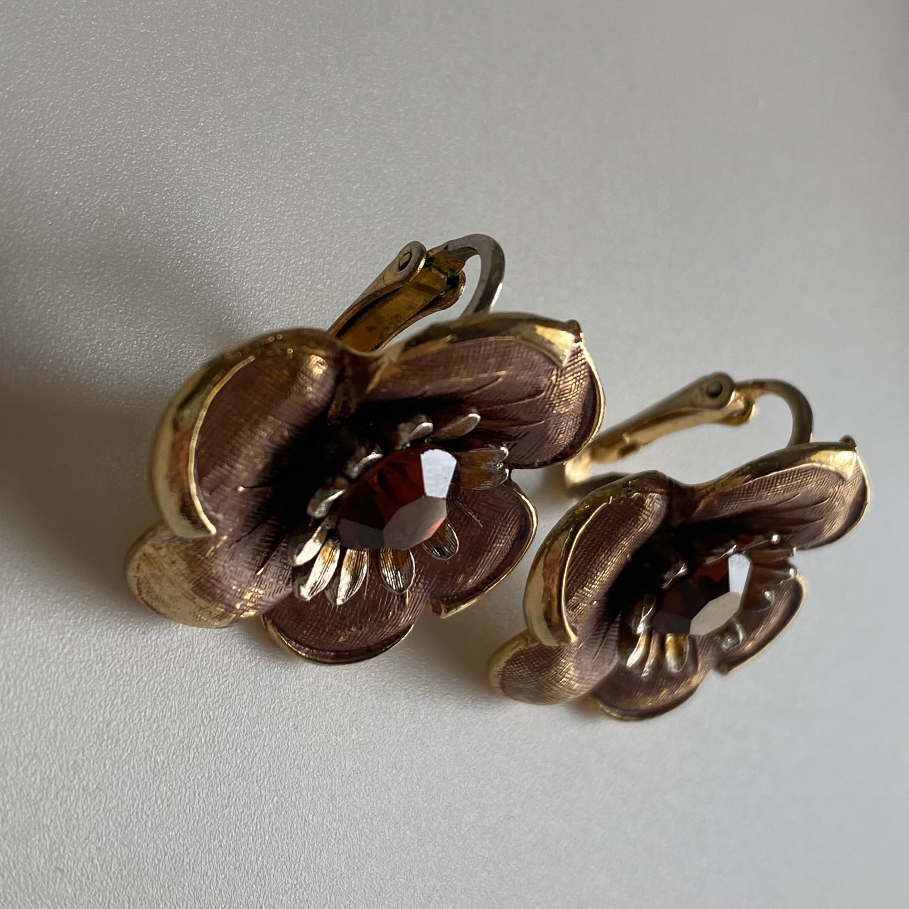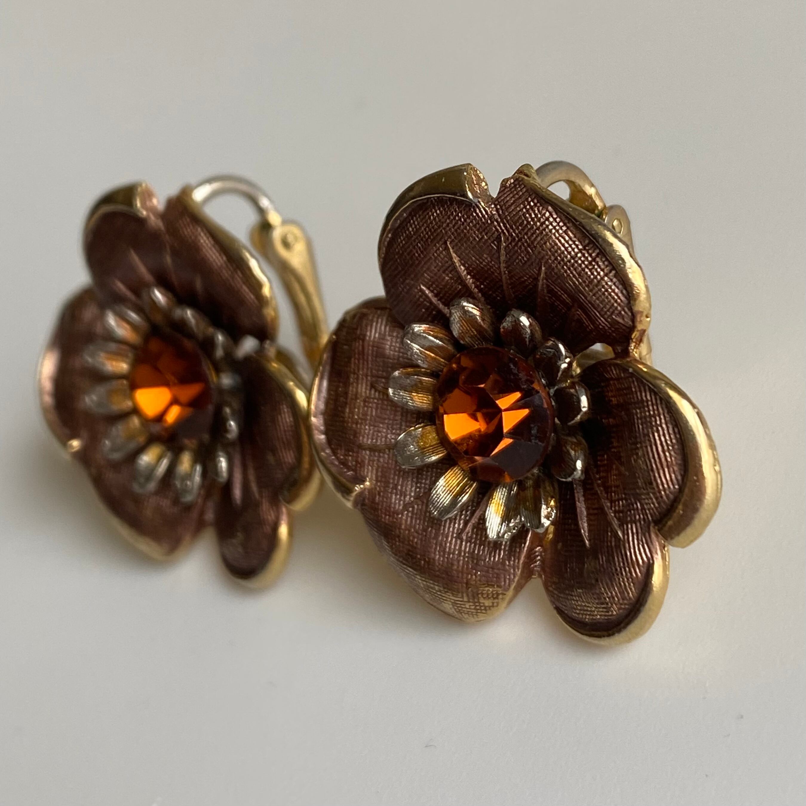 小豆色×ヒヤシンスオレンジで仕立てられたフラワーモチーフのイヤリングです。フラワーメタルベースにうっすらと小豆色の花弁が色付いたデザインです。落ち着いた色味で雰囲気がグッとシックになり引き締まりますね。