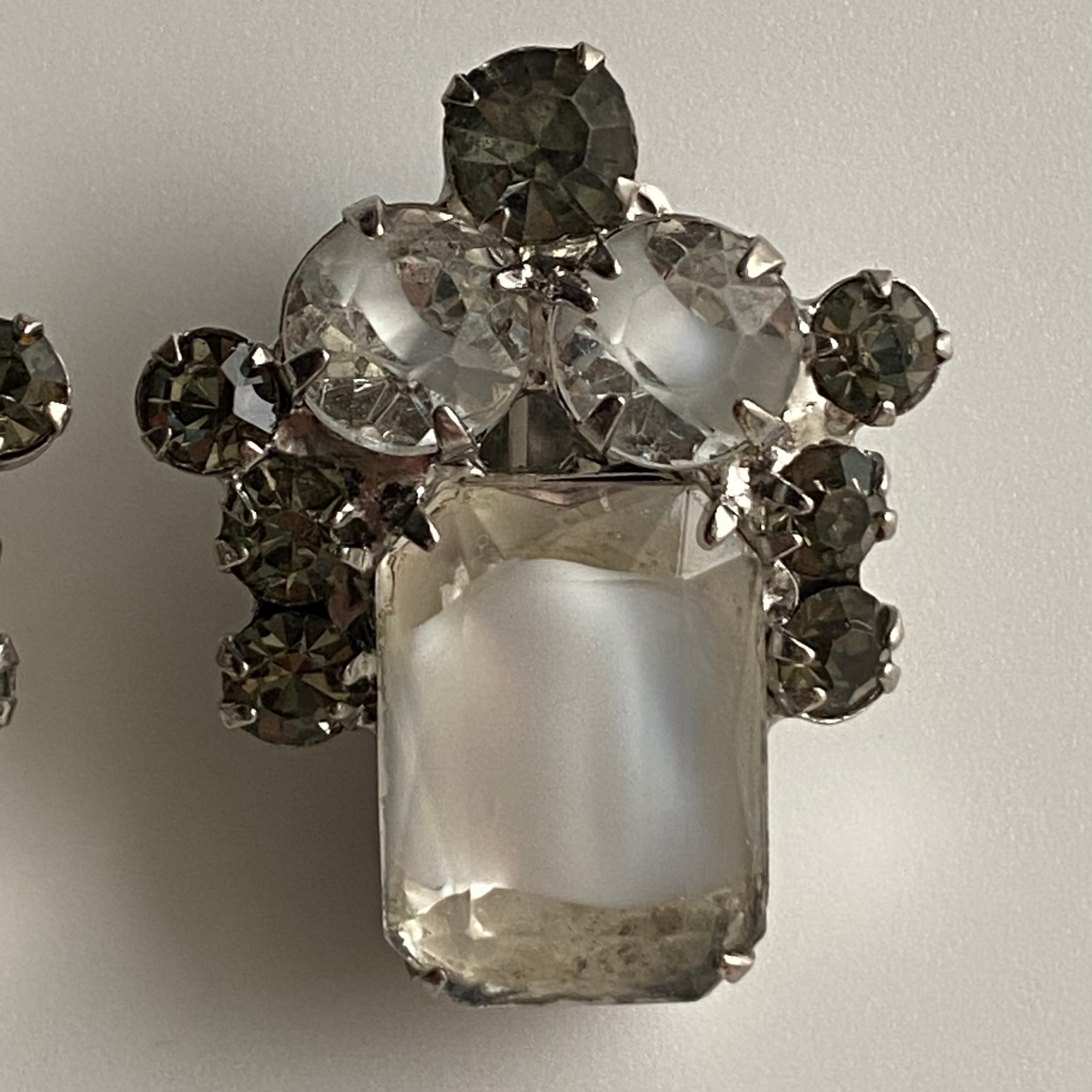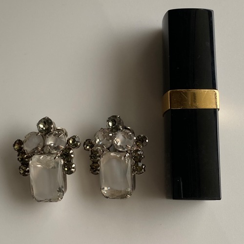 すりガラスのようなクリスタル×グレーのラインストーンが特徴的なイヤリングです。程よい落ち着きを感じるヴィンテージならではの光り方です。どこか切なさがあり儚い世界観が魅力的です。