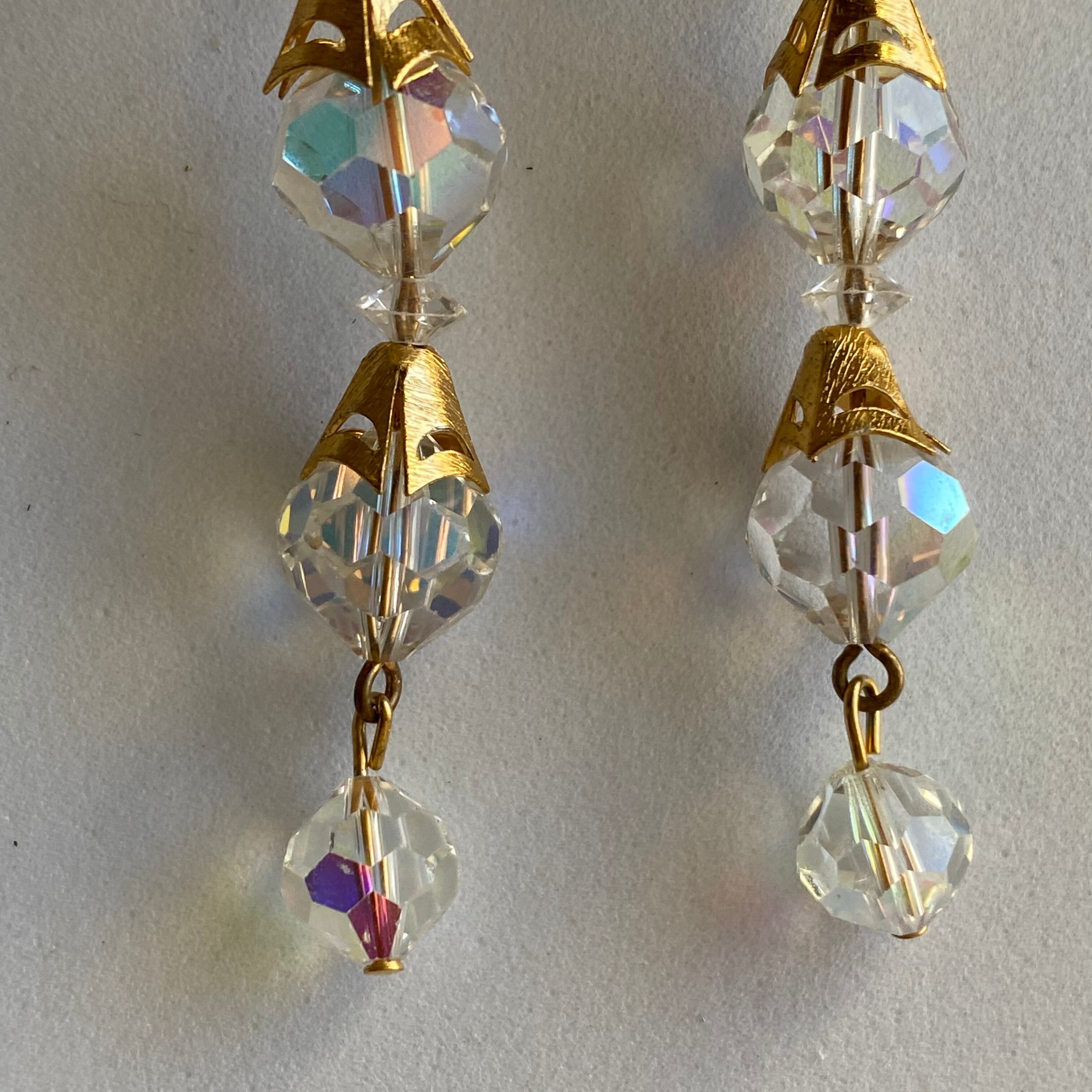 オーロラカットのビーズ×ラインストーン×ゴールドを使用したイヤリングです。オーロラのようなキラキラした光方とゴールドが絶妙にマッチした逸品です。ロングな作りで存在感もありつつ邪魔をしないのでパーティシーンにも出番がありそうですね。