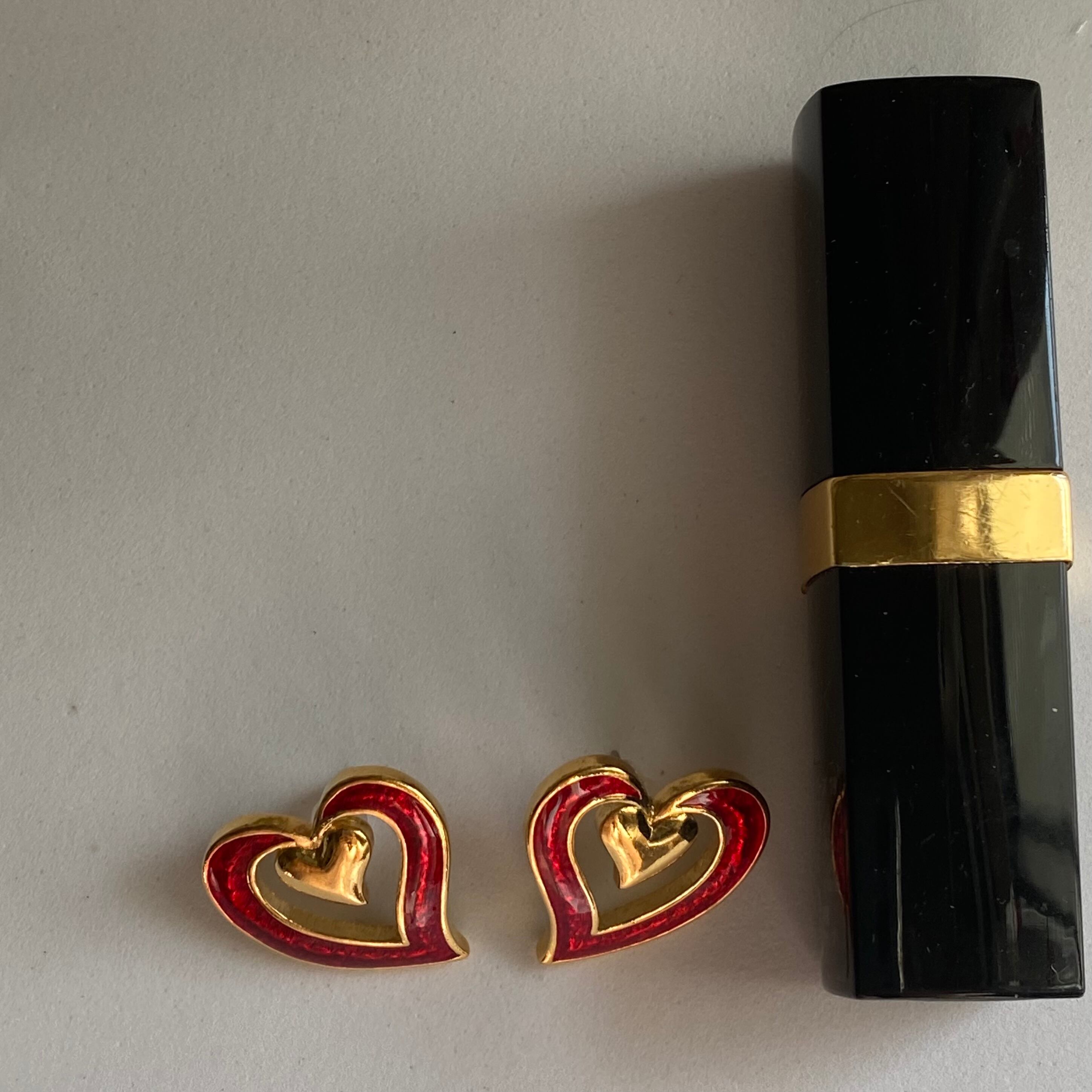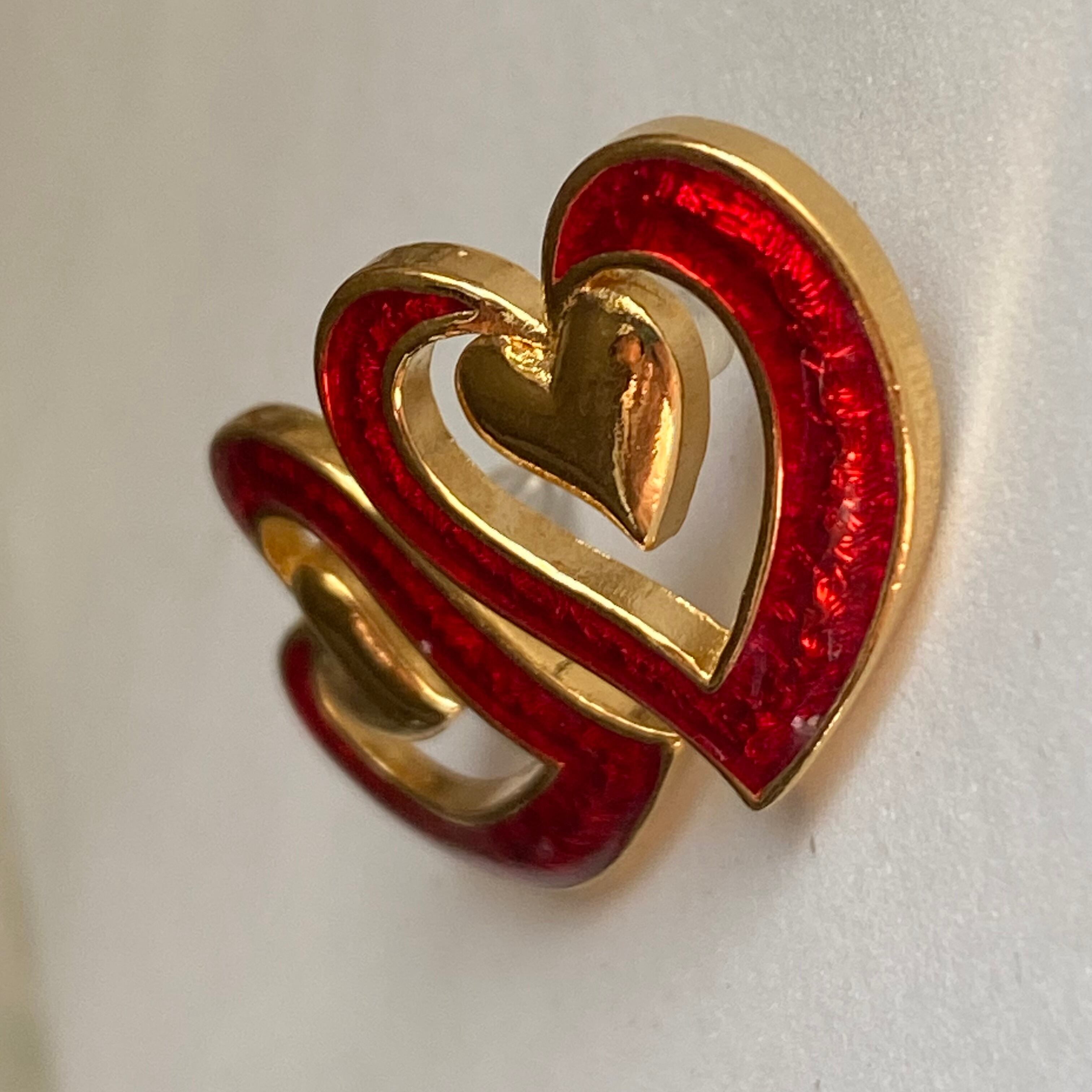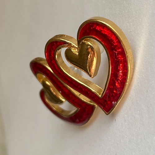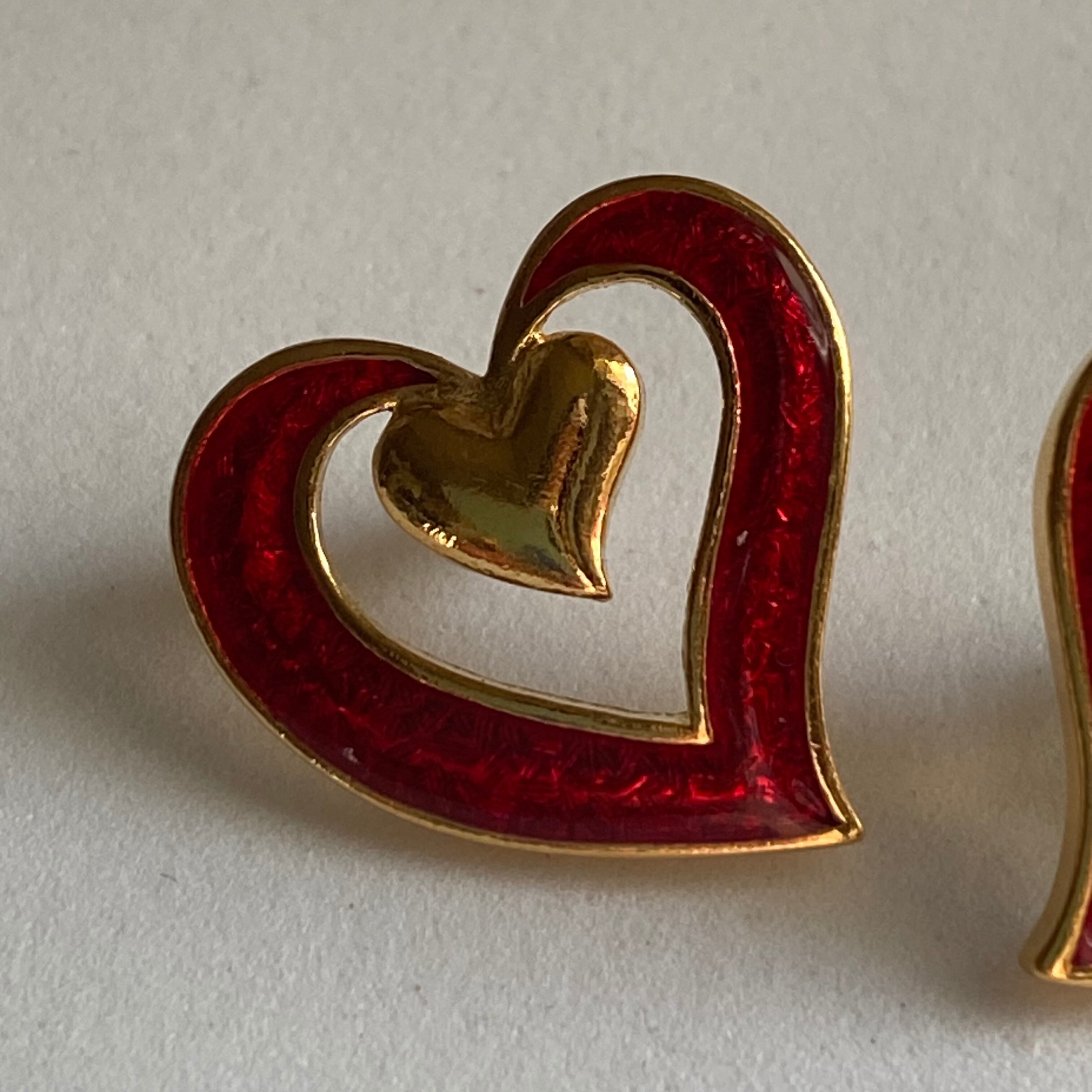 レッドエナメルのハートモチーフのピアスです。赤いハートの中にゴールドのハートがいる愛が詰まったロマンチックなデザインです。