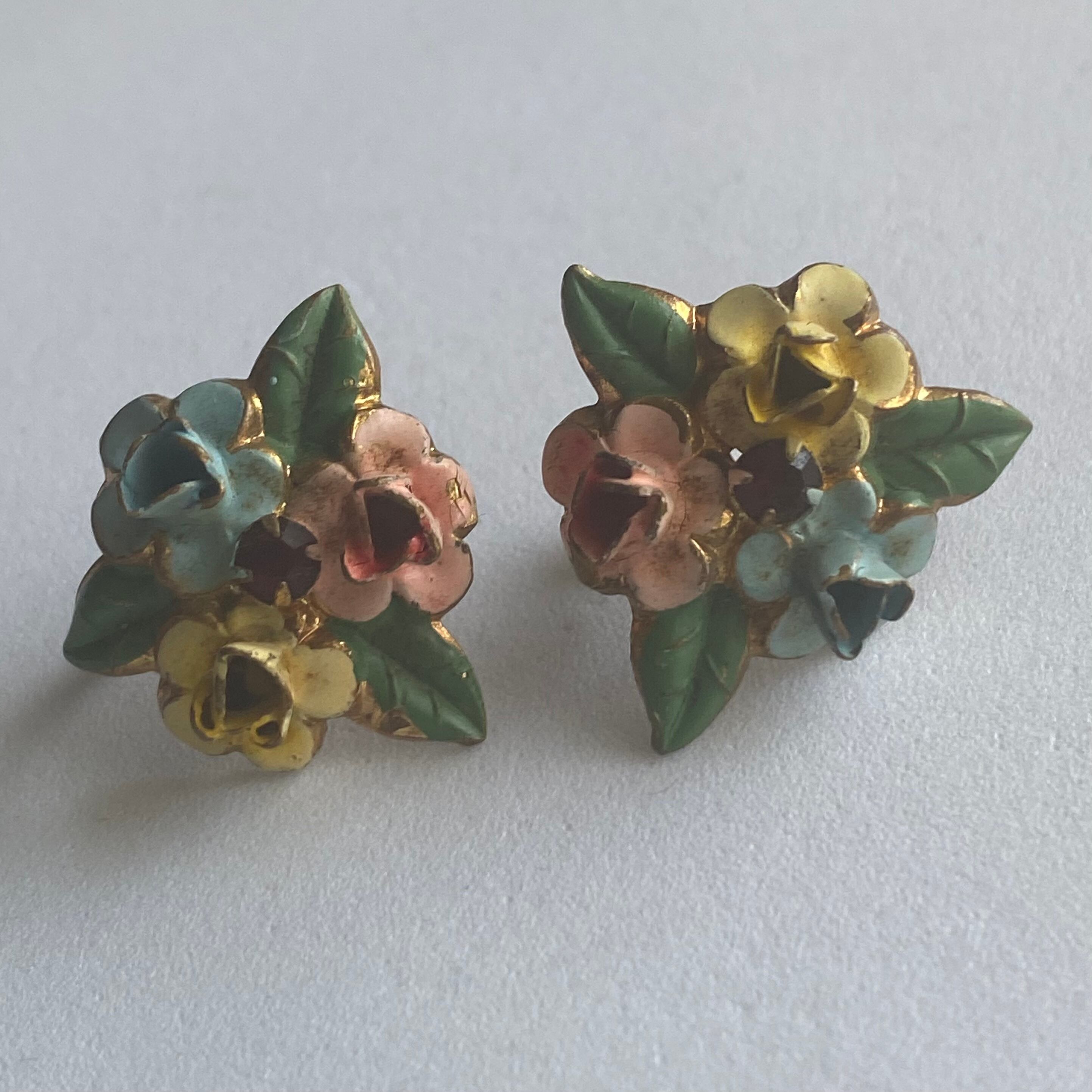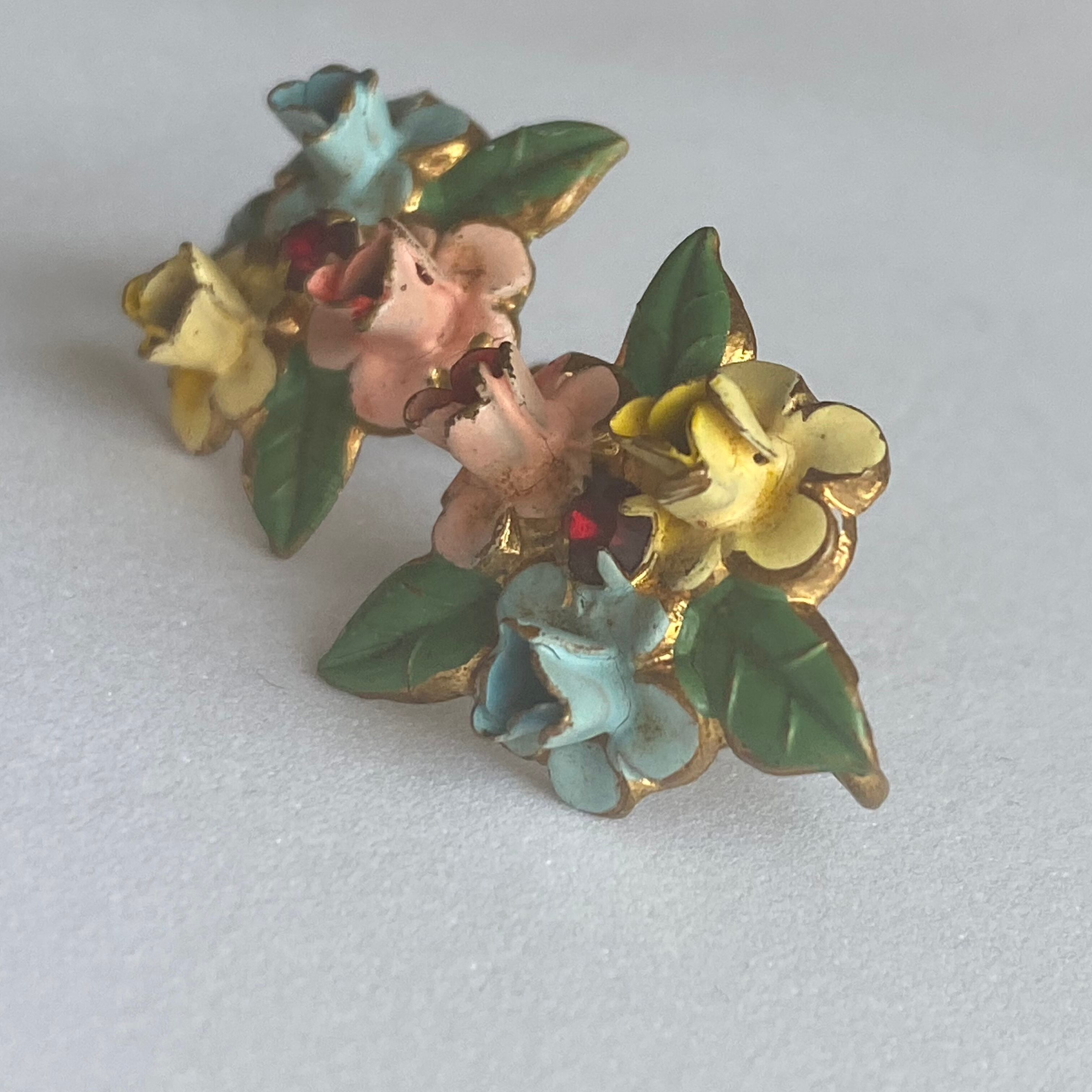 ブーケの一部を切り取ったような鮮やかな花たちがモチーフです。ヴィンテージならではのシャビーな風合いに中心のラインストーンがポイントになっていますね。軽くつけやすいのもおすすめです。