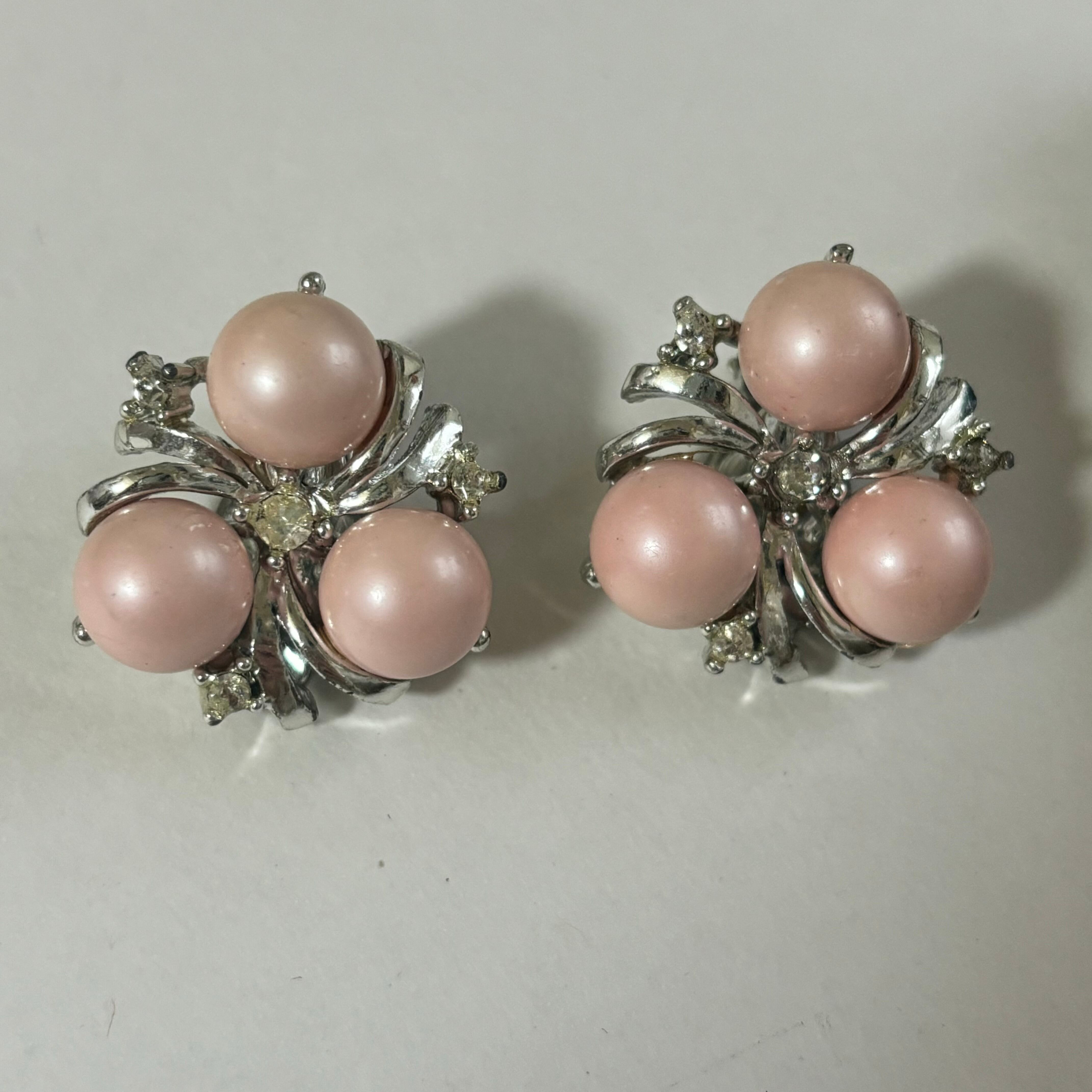 ピンクパール×クリスタル×シルバーのイヤリングです。上品の中に可愛らしさを感じる大人の女性におすすめの逸品です。